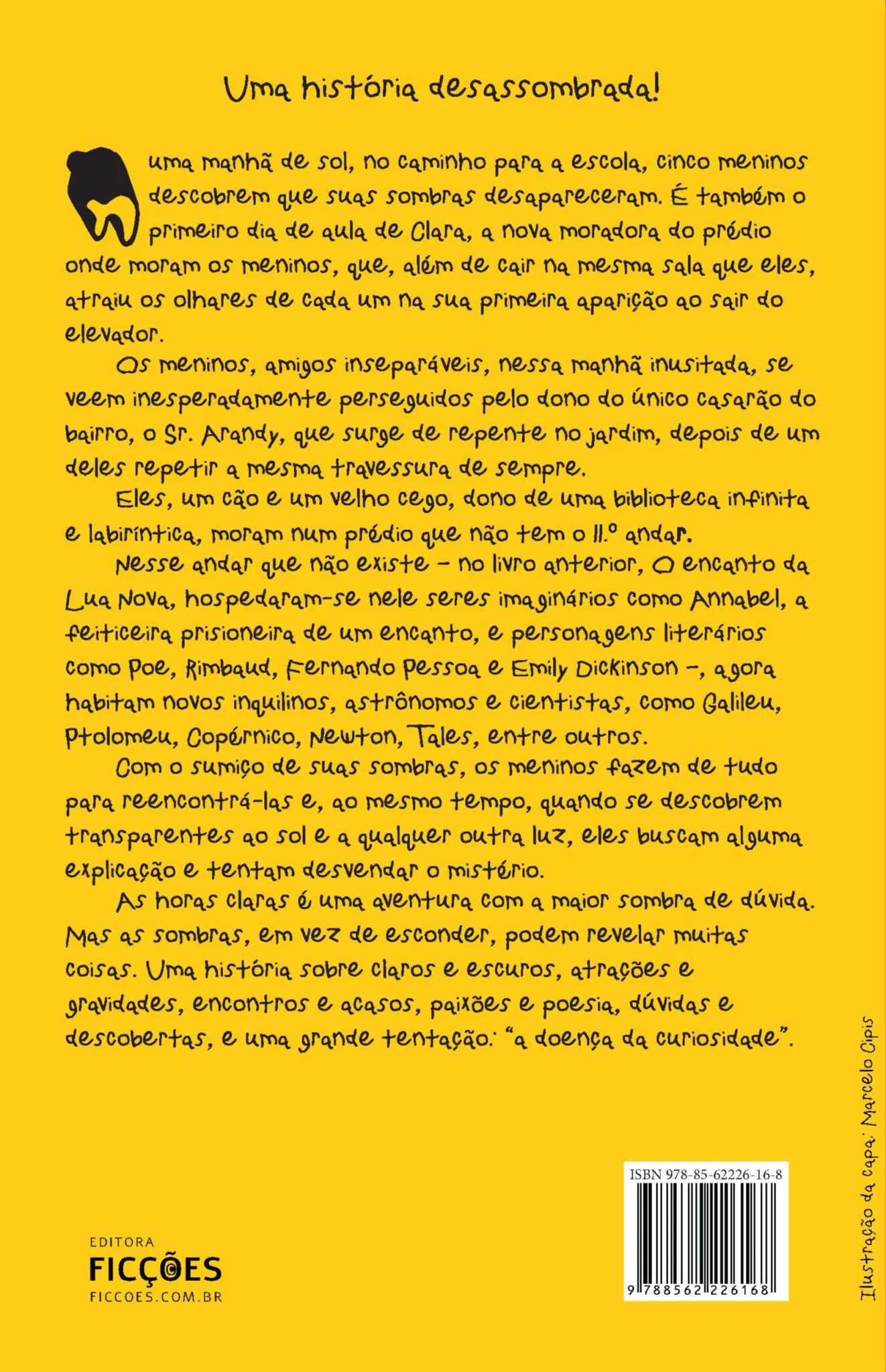 “O amarelo intenso da capa, o título do livro anunciando horas claras e os desenhos do Marcelo Cipis espalhando sombras negras e divertidas me fisgaram de cara. Impossível botar o livro numa pilha, esperando sua hora, sua vez… Pelo menos, dar uma espiadinha…