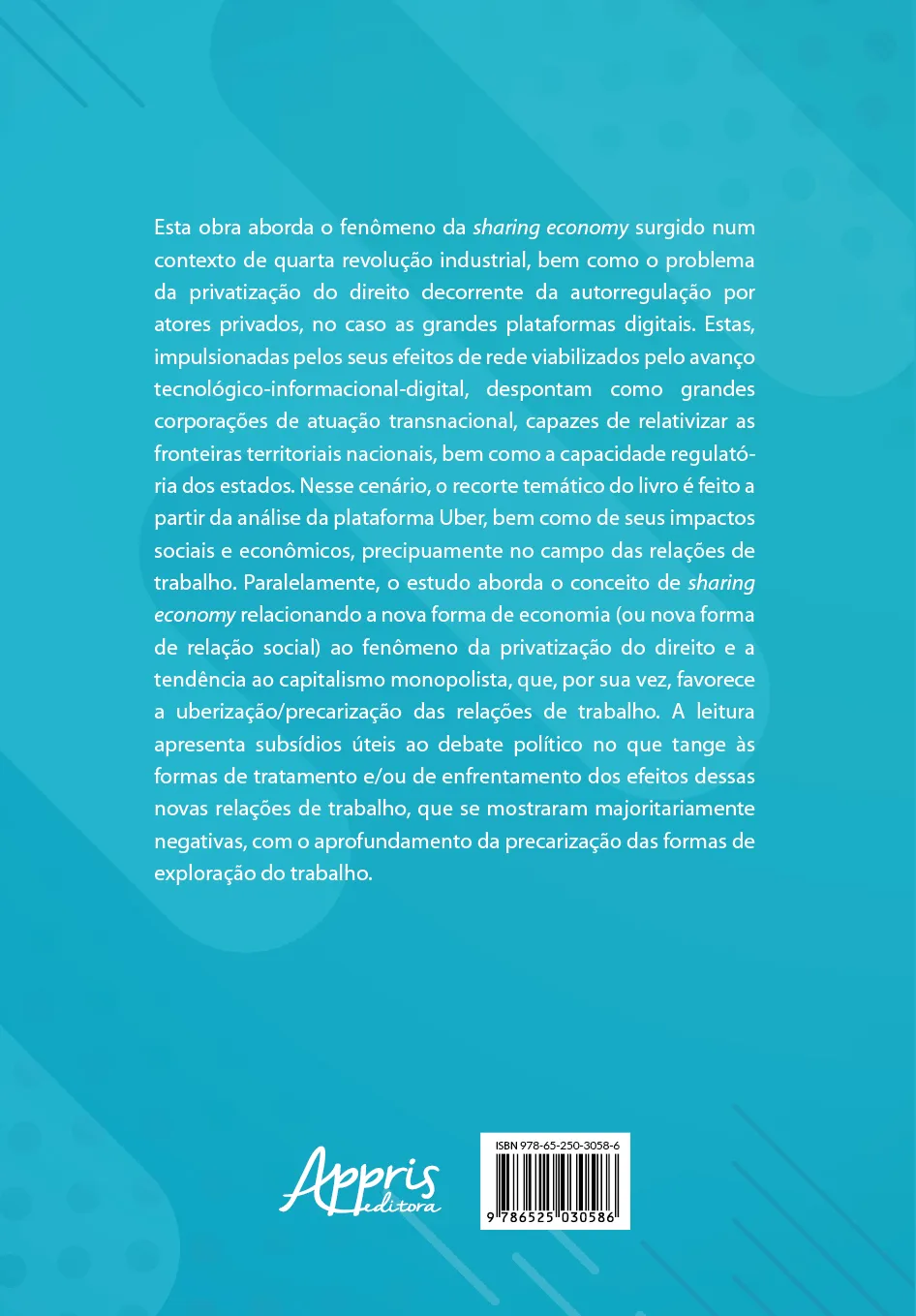 Esta obra aborda o fenômeno da sharing economy surgido num contexto de quarta revolução industrial, bem como o problema da privatização do direito decorrente da autorregulação por atores privados, no caso as grandes plataformas digitais. Estas, impulsionadas pelos seus efeitos de rede viabilizados pelo avanço tecnológico-informacional-digital, despontam como grandes corporações de atuação transnacional, capazes de relativizar as fronteiras territoriais nacionais, bem como a capacidade regulatória dos estados. Nesse cenário, o recorte temático do livro é feito a partir da análise da plataforma Uber, bem como de seus impactos sociais e econômicos, precipuamente no campo das relações de trabalho. Paralelamente, o estudo aborda o conceito de sharing economy relacionando a nova forma de economia (ou nova forma de relação social) ao fenômeno da privatização do direito e a tendência ao capitalismo monopolista, que, por sua vez, favorece a uberização/precarização das relações de trabalho. A leitura apresenta subsídios úteis ao debate político no que tange às formas de tratamento e/ou de enfrentamento dos efeitos dessas novas relações de trabalho, que se mostraram majoritariamente negativas, com o aprofundamento da precarização das formas de exploração do trabalho.