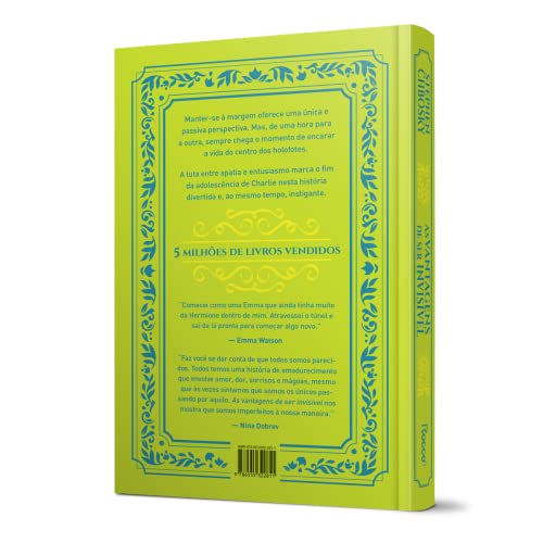 O LIVRO QUE INSPIROU O FILME Manter-se à margem oferece uma única e passiva perspectiva. Mas, de uma hora para outra, sempre chega o momento de encarar a vida do centro dos holofotes. Mais íntimas do que um diário, as cartas de Charlie são estranhas e únicas, hilárias e devastadoras. Não se sabe onde ele mora. Não se sabe para quem ele escreve. Tudo o que se conhece é o mundo que ele compartilha com o leitor. Estar encurralado entre o desejo de viver sua vida e fugir dela o coloca num novo caminho através de um território inexplorado. Um mundo de primeiros encontros amorosos, dramas familiares e novos amigos. Um mundo de sexo, drogas e rock’n’roll, quando o que todo mundo quer é aquela música certa que provoca o impulso perfeito para se sentir infinito. A luta entre apatia e entusiasmo marca o fim da adolescência de Charlie nesta história divertida e ao mesmo tempo instigante.