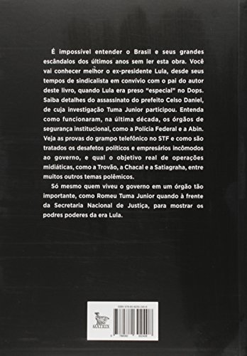É impossível entender o Brasil e seus grandes escândalos dos últimos anos sem ler esta obra. Você vai conhecer melhor o ex-presidente Lula, desde seus tempos de sindicalista em convívio com o pai do autor deste livro, quando Lula era preso “especial” no Dops. Saiba detalhes do assassinato do prefeito Celso Daniel, de cuja investigação Tuma Junior participou. Entenda como funcionaram, na última década, os órgãos de segurança institucional, como a Polícia Federal e a Abin. Veja as provas do grampo telefônico no STF e como são tratados os desafetos políticos e empresários incômodos ao governo, e qual o objetivo real de operações midiáticas, como a Trovão, a Chacal e a Satiagraha, entre muitos outros temas polêmicos. Só mesmo quem viveu o governo em um órgão tão importante, como Romeu Tuma Junior quando à frente da Secretaria Nacional de Justiça, para mostrar os podres poderes da era Lula.