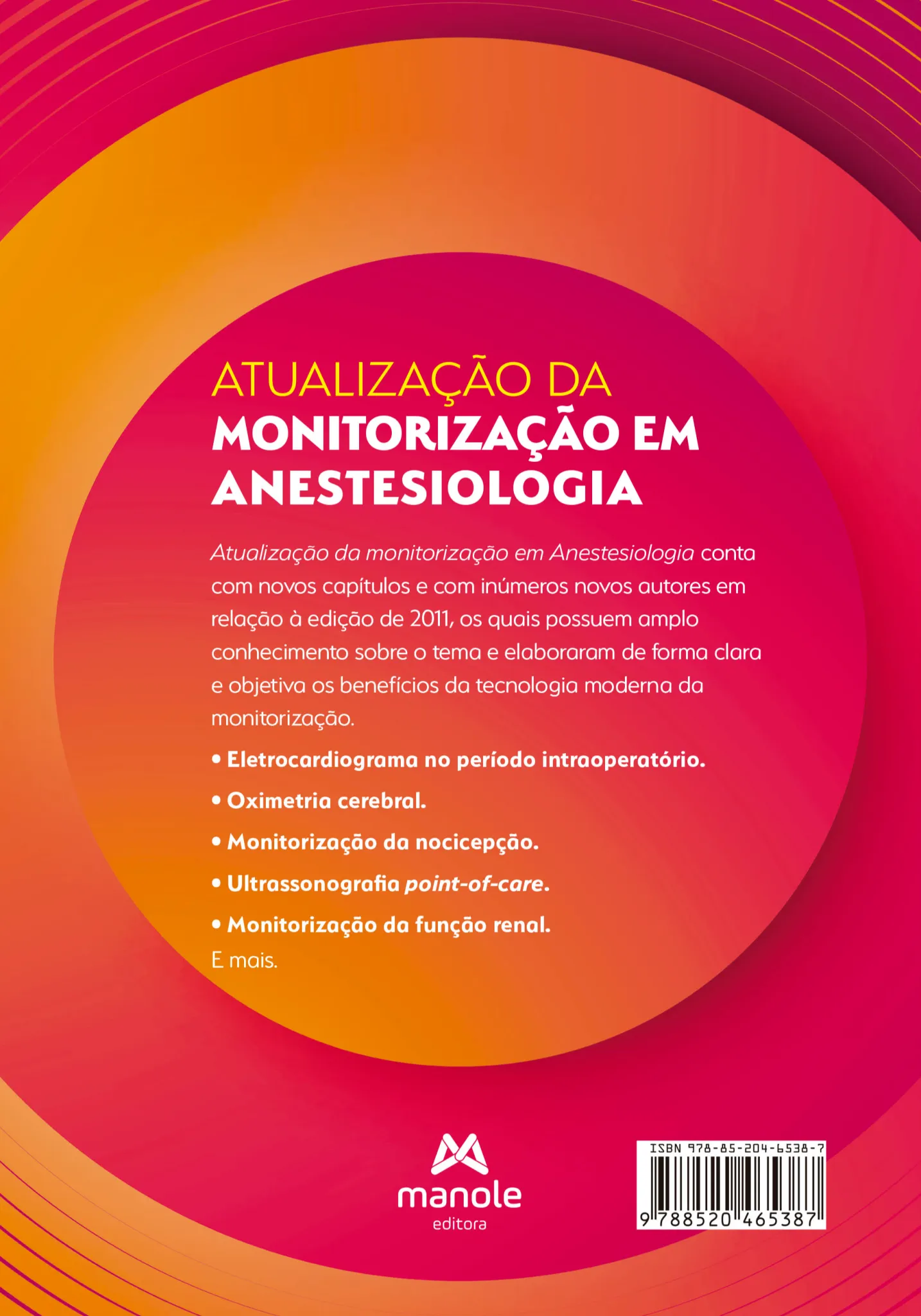 Atualização da monitorização em Anestesiologia conta com novos capítulos e com inúmeros novos autores em relação à edição de 2011, os quais possuem amplo conhecimento sobre o tema e elaboraram de forma clara e objetiva os benefícios da tecnologia moderna da monitorização.