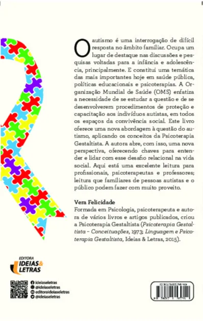 O autismo é uma interrogação de difícil resposta no âmbito familiar. Ocupa um lugar de destaque nas discussões e pesquisas voltadas para a infância e adolescência, principalmente. E constitui uma temática das mais importantes hoje em saúde pública, políticas educacionais e psicoterapias. A Organização Mundial de Saúde (OMS) enfatiza a necessidade de se estudar a questão e de se desenvolverem procedimentos de proteção e capacitação aos indivíduos autistas, em todos os espaços da convivência social. Este livro oferece uma nova abordagem à questão do autismo, aplicando os conceitos da Psicoterapia Gestaltista. A autora abre, com isso, uma nova perspectiva, oferecendo chaves para entender e lidar com esse desafio relacional na vida social. Aqui está uma leitura indispensável para profissionais, psicoterapeutas e professores; leitura que familiares de pessoas autistas e o público podem fazer com muito proveito.
