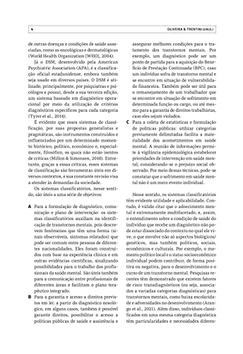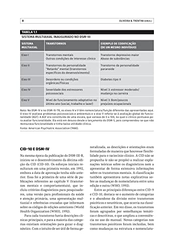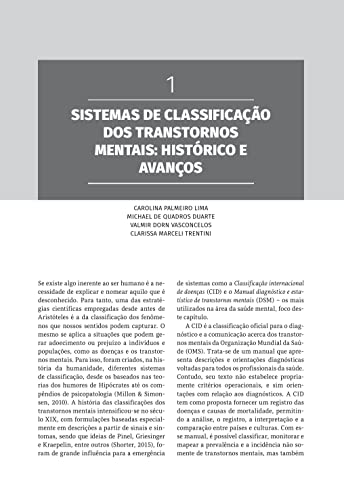 Este livro, organizado pelos professores Sérgio Eduardo Silva de Oliveira e Clarissa Marceli Trentini, reúne destacados autores, todos especialistas do Grupo de Trabalho Avaliação Psicológica e Psicopatologia, da Associação Nacional de Pesquisa e Pós-graduação em Psicologia (ANPEPP), a fim de atualizar os pesquisadores e profissionais brasileiros que trabalham com saúde mental acerca das novas orientações diagnósticas baseadas na CID-11, bem como dos processos diagnósticos de transtornos mentais. Os capítulos apresentam as definições, as orientações diagnósticas, a pesquisa científica e os instrumentos de medida para os principais transtornos mentais descritos na CID-11. Entre outros temas, a obra abrange tópicos como: sistemas de classificação de psicopatologias, instrumentos e modelos de avaliação, limiares entre saúde e transtorno mental, tomada de decisão diagnóstica, técnicas de avaliação e modelos dimensionais.