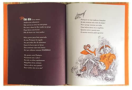 Do ano de 1881, da bela Florença Ao escritor Collodi pedimos licença Para recontar mais uma vez esta história Que até hoje resiste em nossa memória As aventuras de Pinóquio, menino brinquedo Esculpido pelas mãos do velho Mestre Gepeto! Crianças levadas, crianças boazinhas e também as traquinas Estão todas convidadas a mergulhar nessas rimas Escutem o grilo, tenham cuidado com a raposa amiga Evitem o perigo, desviem da mentira, não criem intriga Esta história é de fazer chorar e traz boas risadas Existe um mundo inteiro neste conto de fadas.