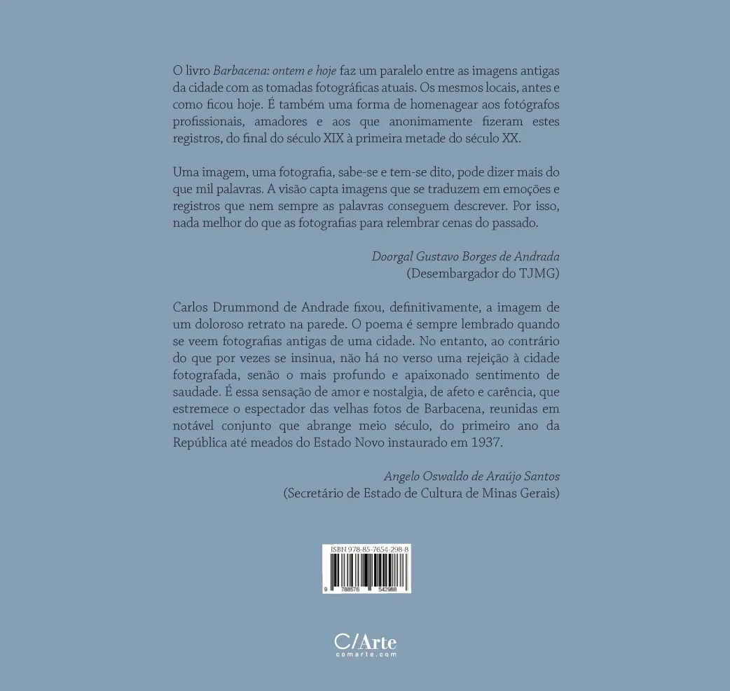 “O livro Barbacena Ontem e Hoje faz um paralelo entre as imagens antigas da cidade com as tomadas fotográficas atuais. Os mesmos locais, antes e como ficou hoje. É também uma forma de homenagear aos fotógrafos profissionais, amadores e aos que anonimamente fizeram estes registros, do final do século XIX à primeira metade do século XX”, como registra em seu texto Doorgal Andrada.