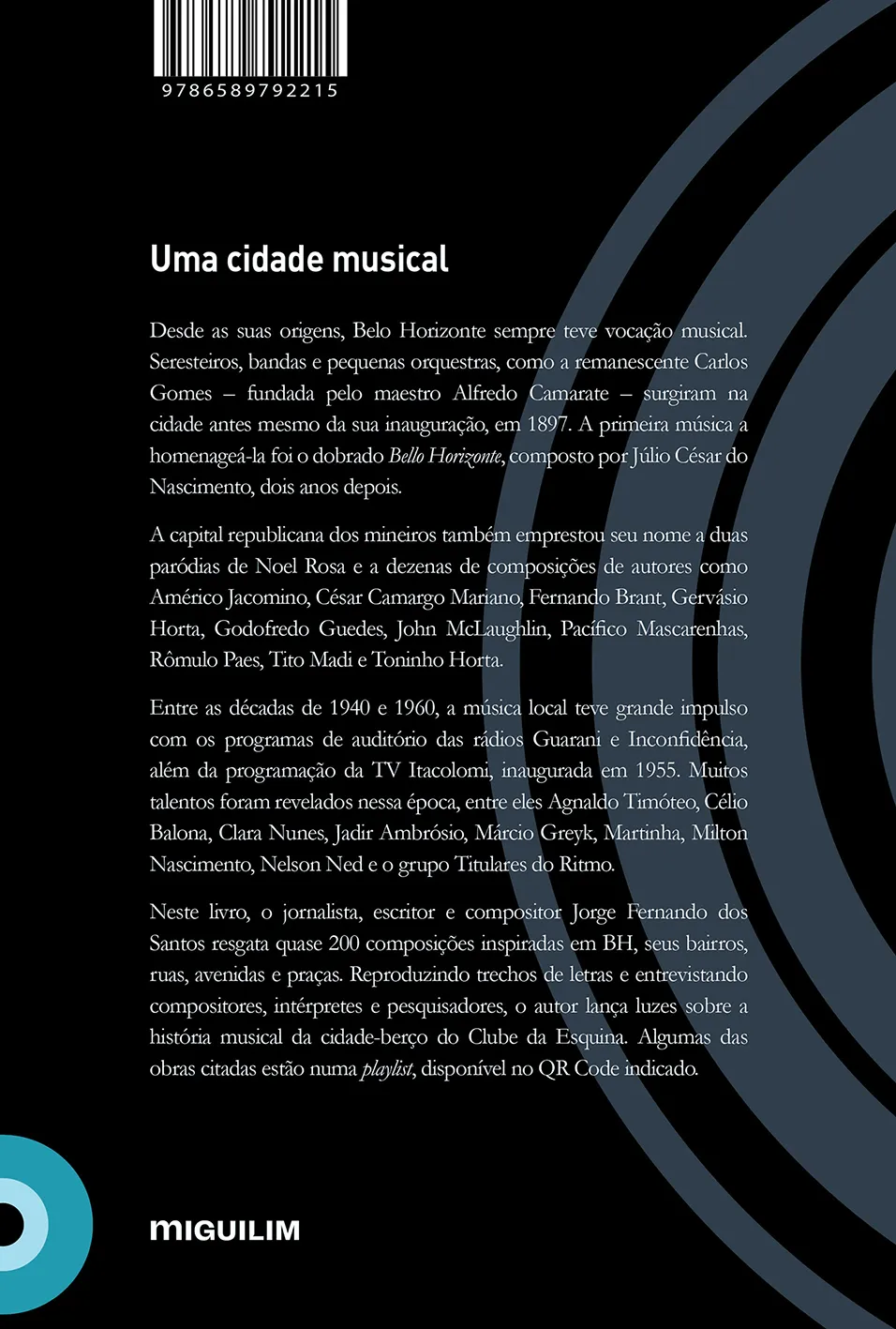 Neste livro, o jornalista, escritor e compositor Jorge Fernando dos Santos resgata quase 200 composições inspiradas em BH, seus bairros, ruas, avenidas e praças. Reproduzindo trechos de letras e entrevistando compositores, intérpretes e pesquisadores, o autor lança luzes sobre a história musical da cidade-berço do Clube da Esquina. Algumas das obras citadas estão numa playlist, disponível no QR Code indicado.