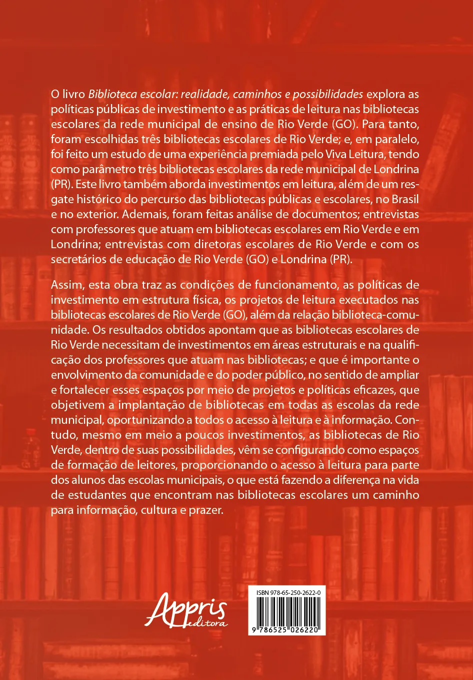 O livro Biblioteca escolar: realidade, caminhos e possibilidades explora as políticas públicas de investimento e as práticas de leitura nas bibliotecas escolares da rede municipal de ensino de Rio Verde (GO). Para tanto, foram escolhidas três bibliotecas escolares de Rio Verde; e, em paralelo, foi feito um estudo de uma experiência premiada pelo Viva Leitura, tendo como parâmetro três bibliotecas escolares da rede municipal de Londrina (PR). Este livro também aborda investimentos em leitura, além de um resgate histórico do percurso das bibliotecas públicas e escolares, no Brasil e no exterior. Ademais, foram feitas análise de documentos; entrevistas com professores que atuam em bibliotecas escolares em Rio Verde e em Londrina; entrevistas com diretoras escolares de Rio Verde e com os secretários de educação de Rio Verde (GO) e Londrina (PR).