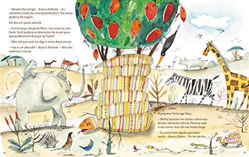 Os animais estão muito, muito famintos. Então eles veem uma árvore maravilhosa, coberta de frutos vermelhos e maduros, que exalam o aroma de doces mangas, são gordos como melões e suculentos como tâmaras… MAS… Enrolado em volta da árvore está o MAIOR PÍTON que eles tinham visto na vida. E o Píton só vai deixar os animais comerem as frutas se eles disserem o nome da árvore. Qual será o nome? O Rei da Floresta é o único que sabe, e ele mora longe, muito longe…
