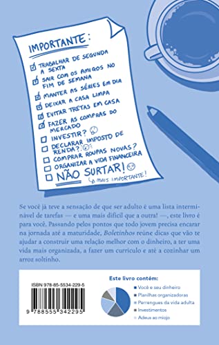 O manual de que todo jovem precisa para encarar a vida adulta e fazer as pazes com o dinheiro. O primeiro emprego, os boletos que não param de chegar, as contas que não fecham, a vida social atribulada… Pois é, ninguém falou que ser adulto era fácil, mas você não precisa passar por esse momento sozinho. Boletinhos é o guia perfeito para te acompanhar nessa jornada. O livro explica de forma clara e descontraída como organizar as suas finanças, economizar um pouquinho todo mês e criar hábitos financeiros mais saudáveis. E, como a vida vai muito além do dinheiro, você também vai encontrar orientações sobre assuntos que sempre causam confusão: como montar o currículo perfeito? Como declarar o imposto de renda? Dá para começar a investir já no início da carreira? Alan Soares criou o @boletinhos para levar aos jovens informações mais acessíveis sobre finanças. Agora a página no Instagram virou este guia que mostra como a vida adulta, apesar de complicada, também pode ser a nossa melhor fase — com independência e liberdade para trilharmos o nosso caminho.