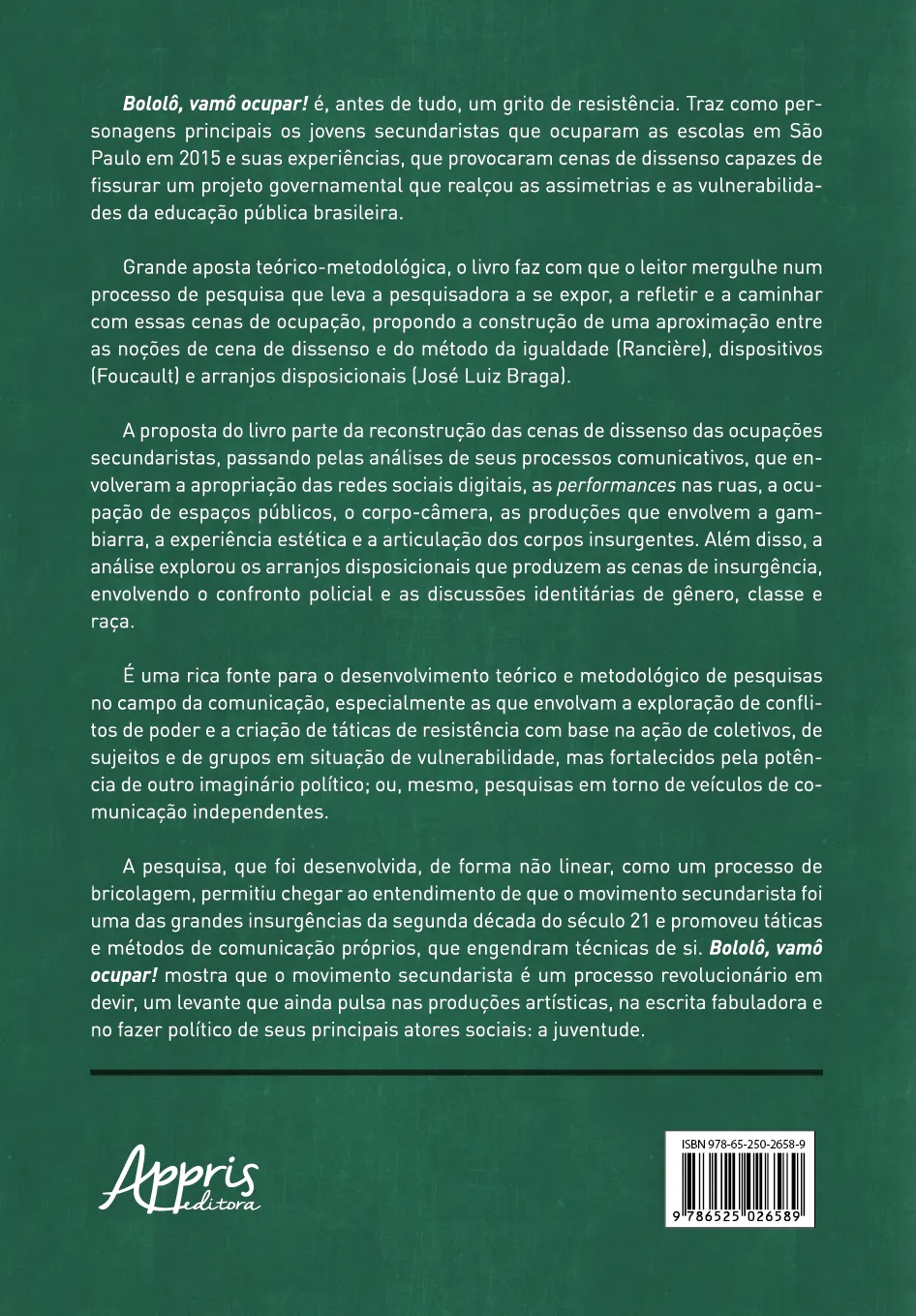A proposta do livro parte da reconstrução das cenas de dissenso das ocupações secundaristas, passando pelas análises de seus processos comunicativos, que envolveram a apropriação das redes sociais digitais, as performances nas ruas, a ocupação de espaços públicos, o corpo-câmera, as produções que envolvem a gambiarra, a experiência estética e a articulação dos corpos insurgentes. Além disso, a análise explorou os arranjos disposicionais que produzem as cenas de insurgência, envolvendo o confronto policial e as discussões identitárias de gênero, classe e raça.