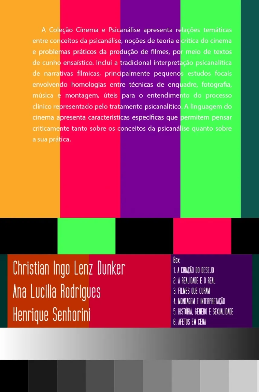 Como toda obra cultural, o cinema também é uma construção que vai além de uma história. Embora pareça redundante falar que toda narrativa é, na verdade, uma metáfora que apresenta em seu segundo plano de leitura uma discussão sobre valores, ideologias e conceitos, a repetição dessa afirmação não a torna menos verdade. Embora subjetiva como toda avaliação de um produto cultural, o valor de uma produção cinematográfica pode ser avaliado, também, por quão bem ele discute os assuntos que traz em seu segundo plano e como eles são retratados na narrativa de primeiro plano. É sobre essa relação entre representação e significado que trata a coleção Cinema & Psicanálise, organizado por Christian Ingo Lenz Dunker e Ana Lucilia Rodrigues.Divida em seis volumes: A formação do desejo, A realidade e o real, Filmes que curam, Montagem e interpretação e História, gênero e sexualidade e Afetos em Cena.