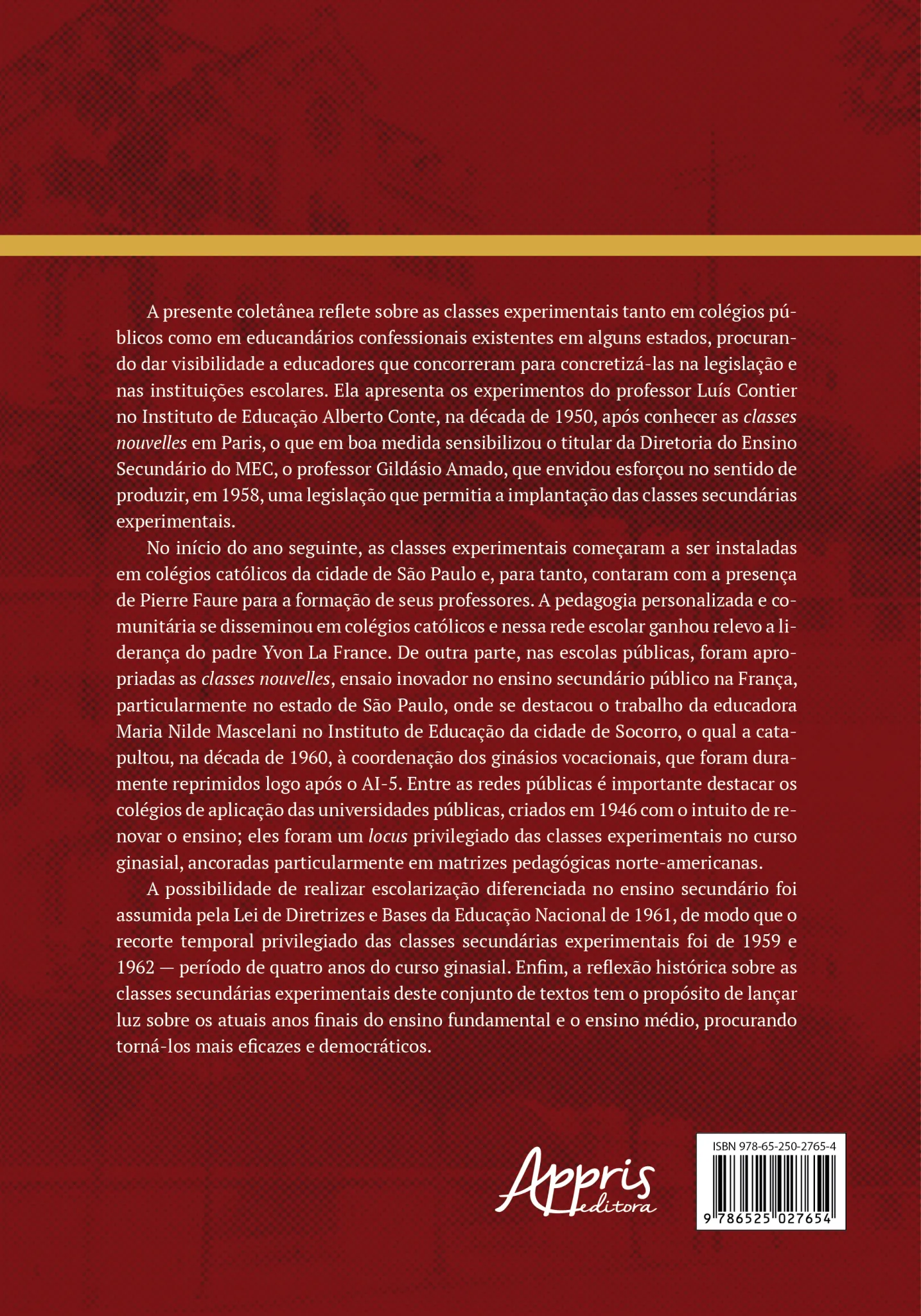 A presente coletânea reflete sobre as classes experimentais tanto em colégios públicos como em educandários confessionais existentes em alguns estados, procurando dar visibilidade a educadores que concorreram para concretizá-las na legislação e nas instituições escolares. Ela apresenta os experimentos do professor Luís Contier no Instituto de Educação Alberto Conte, na década de 1950, após conhecer as classes nouvelles em Paris, o que em boa medida sensibilizou o titular da Diretoria do Ensino Secundário do MEC, o professor Gildásio Amado, que envidou esforçou no sentido de produzir, em 1958, uma legislação que permitia a implantação das classes secundárias experimentais.