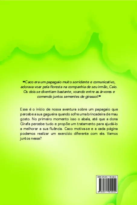 Caco era um papagaio muito sorridente e comunicativo, adorava voar pela floresta na companhia de seu irmão, Caio. Os dois se divertiam bastante, voando entre as árvores e comendo juntos sementes de girassol. Esse é o início de nossa aventura sobre um papagaio que percebe a sua gagueira quando sofre uma brincadeira de mau gosto. No primeiro momento isso o abala, até que a dona Girafa percebe tudo e propõe um tratamento para ajudá-lo a melhorar a sua fluência. Caco motiva-se e a cada página podemos realizar um exercício diferente com ele. Vamos juntos nessa?