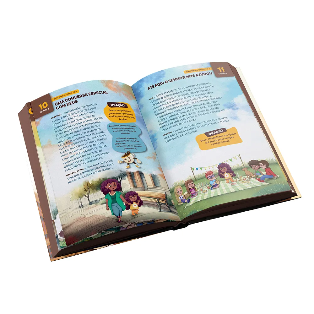 O objetivo é despertar nas crianças o interesse pela Palavra de Deus desde cedo, promovendo valores e ensinamentos relevantes para suas vidas. Esse livro é um companheiro diário que irá incentivar o desenvolvimento cognitivo e espiritual das crianças, por meio de histórias envolventes e ensinamentos que as acompanharão durante todo o ano.