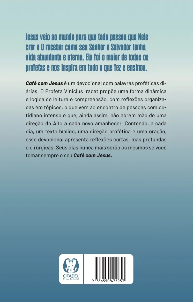 Café com Jesus é um devocional com palavras proféticas diárias. O Profeta Vinicius Iracet propõe uma forma dinâmica e lógica de leitura e compreensão, com reflexões organizadas em tópicos, o que vem ao encontro de pessoas com cotidiano intenso e que, ainda assim, não abrem mão de uma direção do Alto a cada novo amanhecer. Contendo, a cada dia, um texto bíblico, uma direção profética e uma oração, esse devocional apresenta reflexões curtas, mas profundas e cirúrgicas. Seus dias nunca mais serão os mesmos se você tomar sempre o seu Café com Jesus.