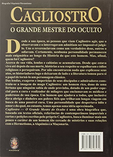 Desde a sua época, as pessoas que viam Cagliostro agir, que o observavam e o interrogavam admitiam ser impossível julgá-lo. Uns o reverenciavam como um verdadeiro deus, outros o odiavam. Certamente, nenhuma personalidade permaneceu mais enigmática ao longo da História do que este homem. Mas, afinal, quem foi Cagliostro? Acerca de sua vida, lendas e calúnias se acumularam. Desde que estava vivo até depois da sua morte, histórias a seu respeito se espalharam e ódios religiosos o perseguiram. Por não encontrarem nada que explicasse seus atos, os historiadores logo o deixaram de lado e a literatura tomou para si o papel de torná-lo um personagem clássico. Das lendas, exageros e imperícias de seus discípulos e admiradores construiu-se a imagem do mago Cagliostro: um homem rico, dono de uma fortuna que ninguém sabia de onde provinha, dotado de um poder especial para a cura e realizador de milagres que enciumavam os médicos e poderosos de sua época. Um homem que ajudava a todos, que inclusive dava abrigo e dinheiro aos pobres fiéis que trilhavam longas viagens em busca de uma possível cura. Uma personalidade que despertava ódio e amor e da qual, no entanto, temos apenas uma idéia aproximada. Cagliostro – O Grande Mestre do Oculto é uma obra biográfica que, baseada em textos oficiais, referências de contemporâneos imparciais e cartas e petições escritas pelo próprio Cagliostro, busca iluminar mais um pouco o caráter de um homem tão cercado de mistérios e suas relações com o Hermetismo, a Alquimia e a Maçonaria.