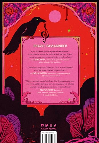 Da incrível imaginação de Giu Domingues, um dos maiores nomes da fantasia nacional, Canção dos Ossos é um romance gótico e sáfico, em que a magia sai das melodias para viver entre as palavras. Feche os olhos e deixe a música te guiar. Ser uma soprano do Conservatório de Vermília é um privilégio. Por meio do canto, é possível criar magia e, talvez, até sonhar com um futuro promissor. E ninguém sabe disso melhor do que Elena Bordula. Ser uma das Prodígios é a única chance ao seu alcance para fugir da sombra dos crimes cometidos pela mãe, que arruinaram o nome da família. No entanto, Elena se encontra em uma encruzilhada: destacar-se perante às outras Prodígios pode colocar em risco o relacionamento entre ela e suas melhores amigas, Margot e Cecília. Um laço que antes parecia ser tão sólido quanto as paredes do Conservatório subitamente ameaça desmoronar a qualquer instante. Mas subir na hierarquia da Orquestra é a chance de Elena provar que é muito mais do que um sobrenome manchado por sangue. A ambição tem um preço, e Elena se sente mais solitária do que nunca… mas ela estará mesmo sozinha? Das sombras da ópera surge uma figura enigmática, provocando inspiração e mistério. Quem é a voz no espelho? Estará Elena sucumbindo à maldição que leva sopranos a enlouquecerem? “Uma leitura orquestrada para ser deslumbrante e assombrosa, uma sedução lenta do leitor para fazê-lo encarar os recantos mais escuros de seu reflexo.” — Laura Pohl, autora de As garotas de Grimrose e best-seller do New York Times. “Um mundo original de fantasia e cheio de musicalidade. Uma história sombria e surpreendente.” — Paola Siviero, autora de O auto da maga Josefa e A lenda da caixa das almas. “Muito à vontade sob os holofotes, Giu Domingues combina sua voz e espírito para esta nova montagem de um clássico absoluto. Um livro para assistir na primeira fileira.” — Felipe Castilho, autor de Ordem vermelha, Serpentário e da série O Legado Folclórico. “Em Canção dos Ossos, Giu Domingues conduz os leitores pelas profundezas mais sombrias do desejo de forma magistral, nos embalando em uma história vertiginosa e arrebatadora. Um banquete para quem ama personagens moralmente ambíguas e ambiciosas.” — Bárbara Morais, autora da Trilogia Anômalos. “Com uma construção de mundo fascinante, essa história sensual e perturbadora convida a encarar as sombras.” — Carol Chiovatto, autora de Porém, bruxa, Árvore inexplicável, Senciente nível 5 e finalista do Prêmio Jabuti. “Com uma narrativa poderosa e personagens que você vai amar e odiar na mesma medida, Canção dos Ossos é avassalador e impossível de largar da primeira à última página. Prepare-se para ser arrebatado pela melodia sombria de Giu Domingues.” — Karine Ribeiro, autora de Secretária de Satã e vencedora do IV Prêmio ABERST de Literatura.