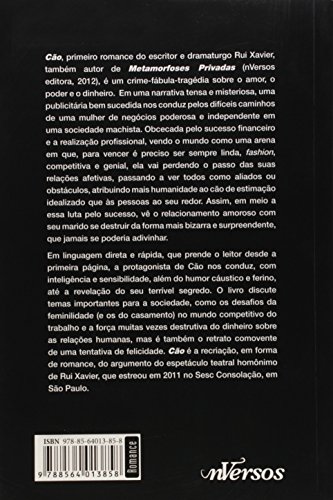 Em linguagem direta e rápida, que prende o leito desde a primeira página, a protagonista de Cão nos conduz, com inteligência e sensibilidade, além do humor cáustico e ferino, até a revelação do seu terrível segredo. O livro discute temas importantes para sociedade, como os desafios da feminilidade (e os do casamento) no mundo competitivo do trabalho e a força muitas vezes destrutiva do dinheiro sobre as relações humanas, mas é também o retrato comovente de uma tentativa de felicidade. Cão é a recriação, em forma de romance, do argumento do espetáculo teatral homônimo de Rui Xavier, que estreou em 2011 no Sesc Consolação, em São Paulo.