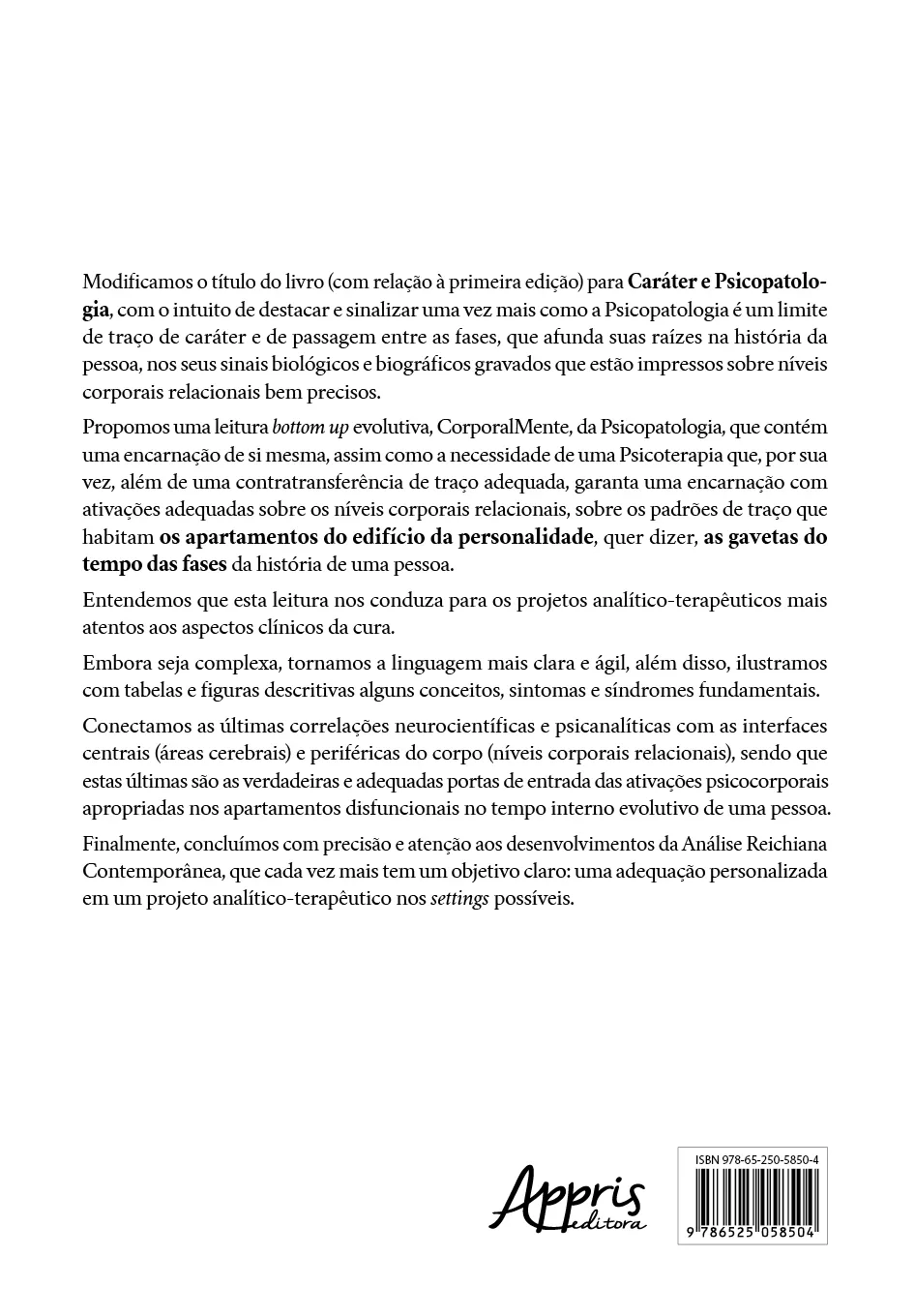 Modificamos o título do livro (com relação à primeira edição) para Caráter e Psicopatologia, com o intuito de destacar e sinalizar uma vez mais como a Psicopatologia é um limite de traço de caráter e de passagem entre as fases, que afunda suas raízes na história da pessoa, nos seus sinais biológicos e biográficos gravados que estão impressos sobre níveis corporais relacionais bem precisos.