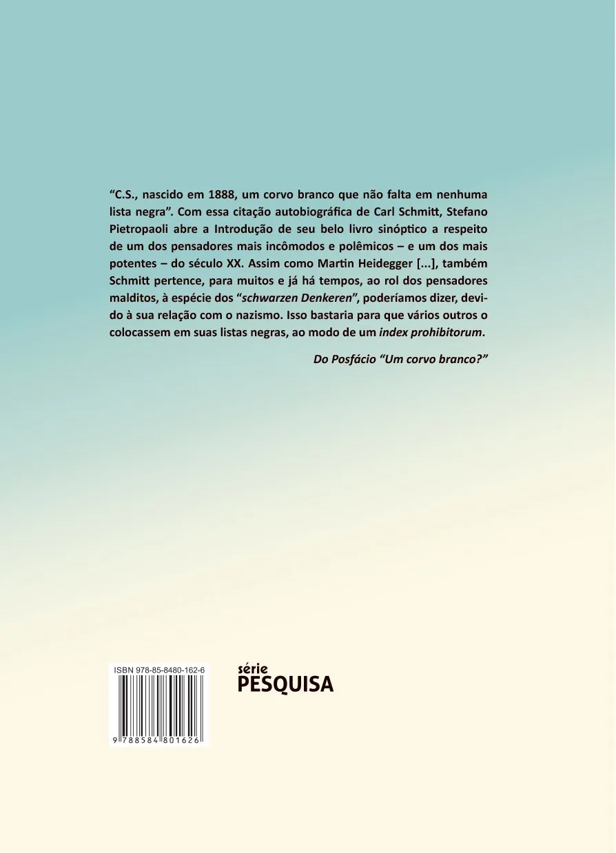 “C.S., nascido em 1888, um corvo branco que não falta em nenhuma lista negra”. Com essa citação autobiográfica de Carl Schmitt, Stefano Pietropaoli abre a introdução de seu belo livro sinóptico a respeito de um dos pensadores mais incômodos e polêmicos – e um dos mais potentes – do século XX. Assim como Martin Heidegger […] também Schmitt pertence, para muitos e já há tempos, ao rol dos pensadores malditos, à espécie dos “schwarzen Denkeren’, poderíamos dizer, devido à sua relação com o nazismo. Isso bastaria para que vários outros o colocassem em suas listas negras, ao modo de um index ptohibitorum. Do posfácio “Um corvo branco?”.
