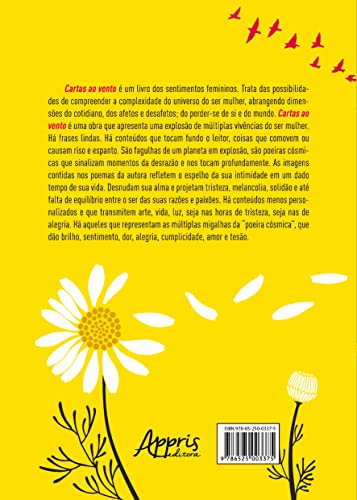 Cartas ao vento é um livro dos sentimentos femininos. Trata das possibilidades de compreender a complexidade do universo do ser mulher, abrangendo dimensões do cotidiano, dos afetos e desafetos; do perder-se de si e do mundo. Cartas ao vento é uma obra que apresenta uma explosão de múltiplas vivências do ser mulher. Há frases lindas. Há conteúdos que tocam fundo o leitor, coisas que comovem ou causam riso e espanto. São fagulhas de um planeta em explosão, são poeiras cósmicas que sinalizam momentos da desrazão e nos tocam profundamente. As imagens contidas nos poemas da autora refletem o espelho da sua intimidade em um dado tempo de sua vida. Desnudam sua alma e projetam tristeza, melancolia, solidão e até falta de equilíbrio entre o ser das suas razões e paixões. Há conteúdos menos personalizados e que transmitem arte, vida, luz, seja nas horas de tristeza, seja nas de alegria. Há aqueles que representam as múltiplas migalhas da “poeira cósmica”, que dão brilho, sentimento, dor, alegria, cumplicidade, amor e tesão.