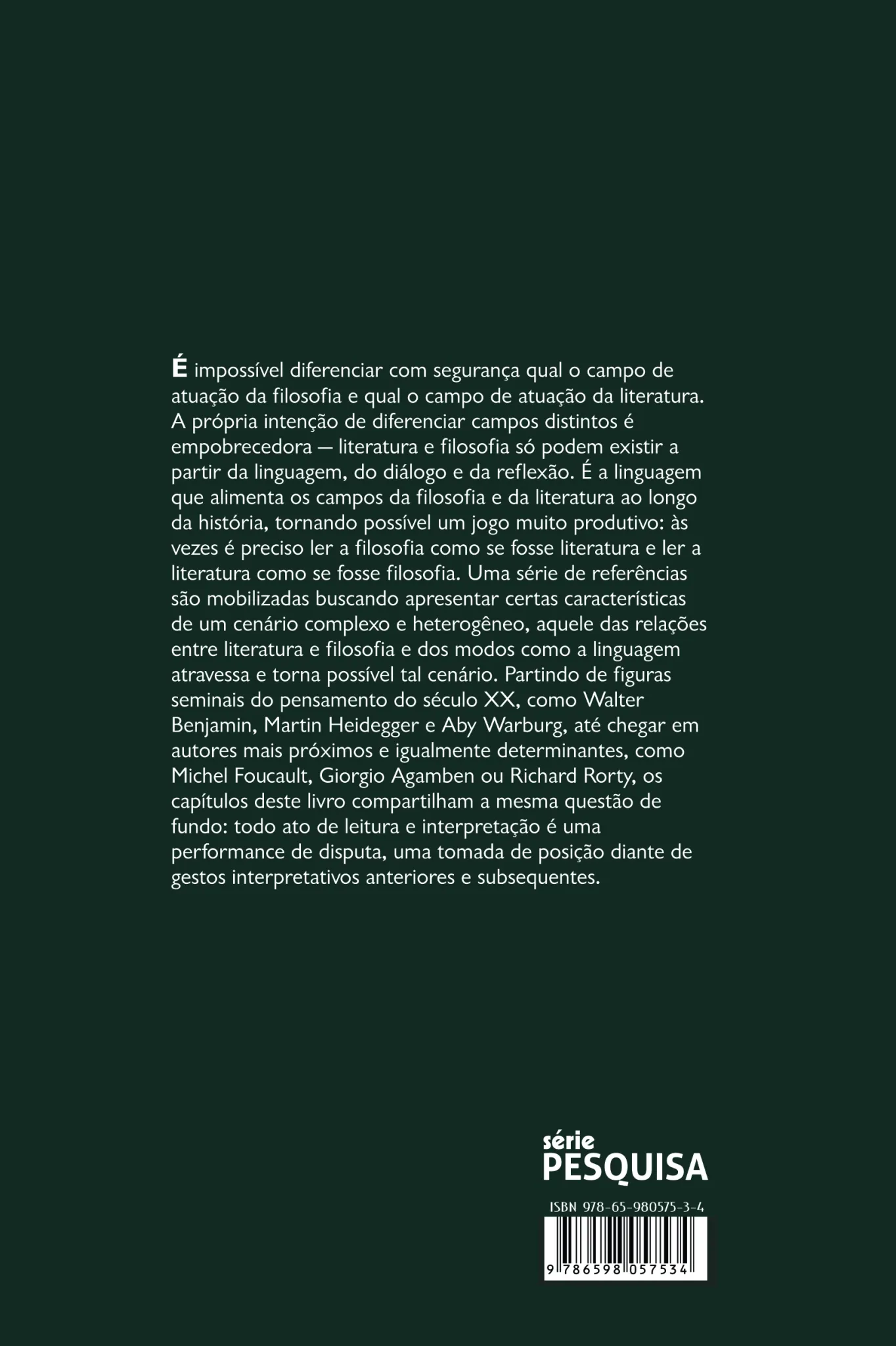 É impossível diferenciar com segurança qual o campo de atuação da filosofia e qual o campo de atuação da literatura. A própria intenção de diferenciar campos distintos é empobrecedora – literatura e filosofia só podem existir a partir da linguagem, do diálogo e da reflexão. É a linguagem que alimenta os campos da filosofia e da literatura ao longo da história, tornando possível um jogo muito produtivo: às vezes é preciso ler a filosofia coo se fosse uma literatura e ler a literatura como se fosse filosofia. Uma série de referências são mobilizadas buscando apresentar certas características de um cenário complexo e heterogêneo, aquele das relações entre literatura e filosofia e dos modos como a linguagem atravessa e torna possível tal cenário. Partindo de figuras seminais do pensamento do século XX, como Walter Benjamin, Martin Heidegger e Aby Warburg, até chegar em autores mais próximos e igualmente determinantes, como Michel Foucault, Giorgio Agamben ou Richard Rorty, os capítulos deste livro compartilham a mesma questão de fundo: todo ato de leitura e interpretação é uma performance de disputa, uma tomada de posição diante de gestos interpretativos anteriores e subsequentes..
