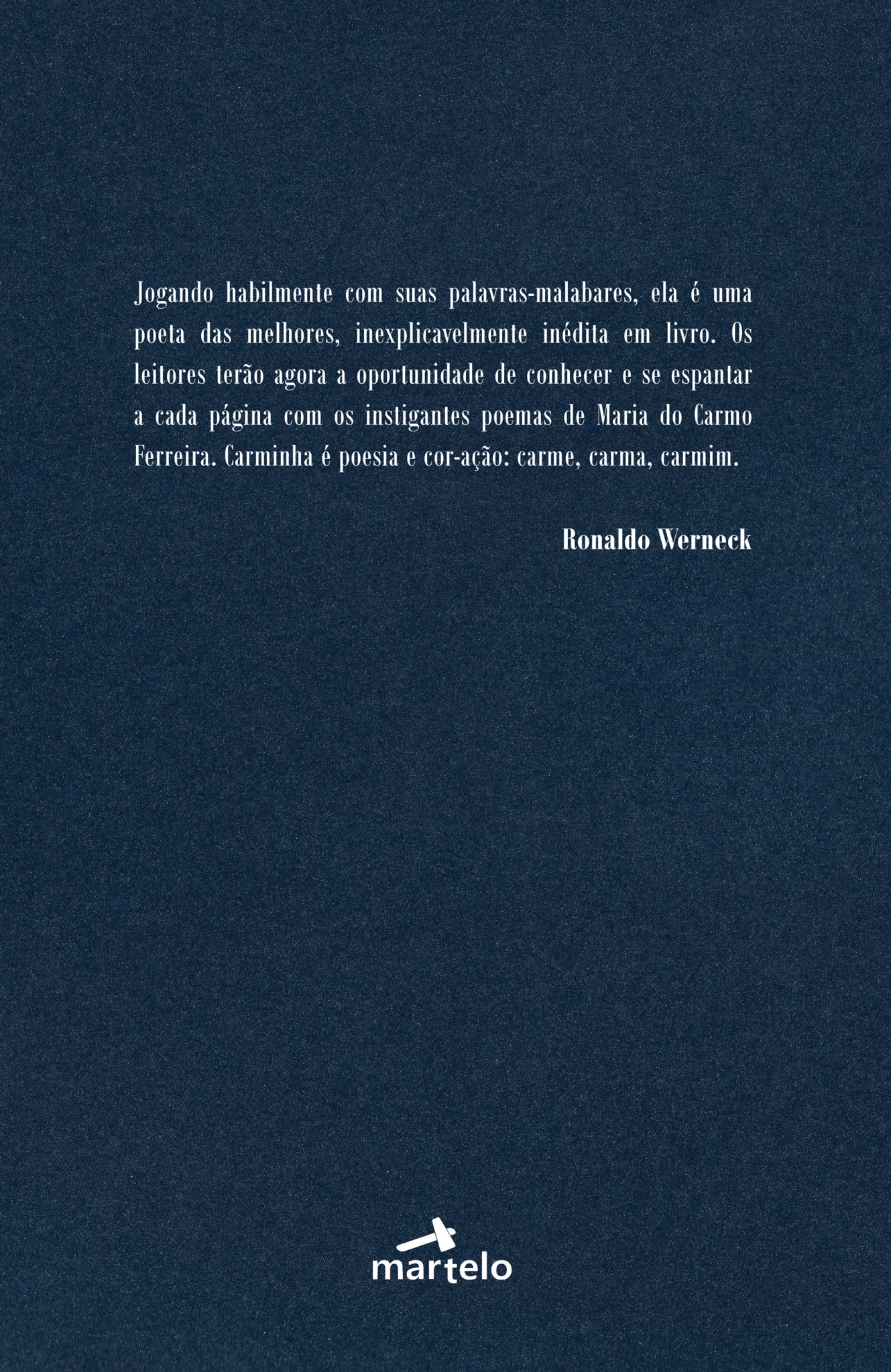 nascida em Cataguases (MG), em 21 de dezembro de 1938, apreciada por nomes como Augusto de Campos, Décio Pignatari e Sebastião Nunes, e restrita ao conhecimento de pouquíssimos leitores, pela primeira vez a poesia de Maria do Carmo Ferreira é publicada em livro. organizado por Fabrício Marques e Silvana Guimarães, “Cave Carmen” (‘livro um’ de sua “Poesia reunida”), traz os poemas divididos em quatro partes: ‘Abertura’, ‘Um carma, um carme, um carmim’, ‘Di’Amantes’ e ‘O corpo da memória’, além de posfácio de Silvana Guimarães. o volume 31 da ‘coleção cabeça de poeta’, ‘série contemporanea’, que traz um pouco da melhor produção poética no Brasil, tem a alegria e o orgulho de colocar no circuito literário uma das melhores poetas brasileiras.