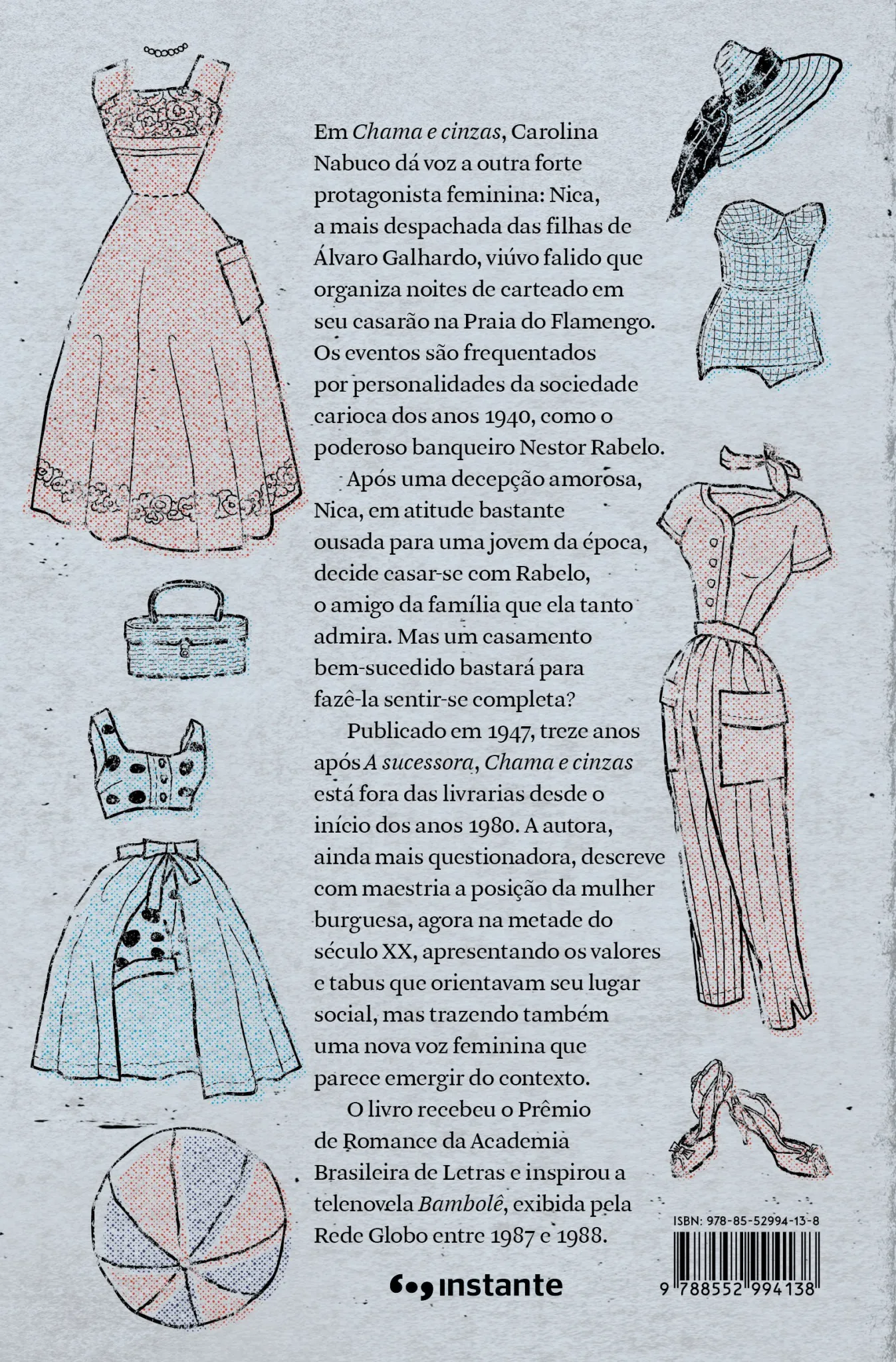 Em Chama e cinzas, Carolina Nabuco mais uma vez faz um retrato da posição da mulher burguesa, agora no final da primeira metade do século XX, apresentando os valores e os tabus que orientavam o lugar social da mulher, mas trazendo também uma nova voz feminina que parece emergir desse contexto. Há, com isso, um distanciamento significativo de A sucessora, seu romance anterior, uma vez que naquela obra a protagonista Marina teme não ser a mulher ideal, enquanto Nica, a nova protagonista, deseja compreender por que tem sido essa mulher.