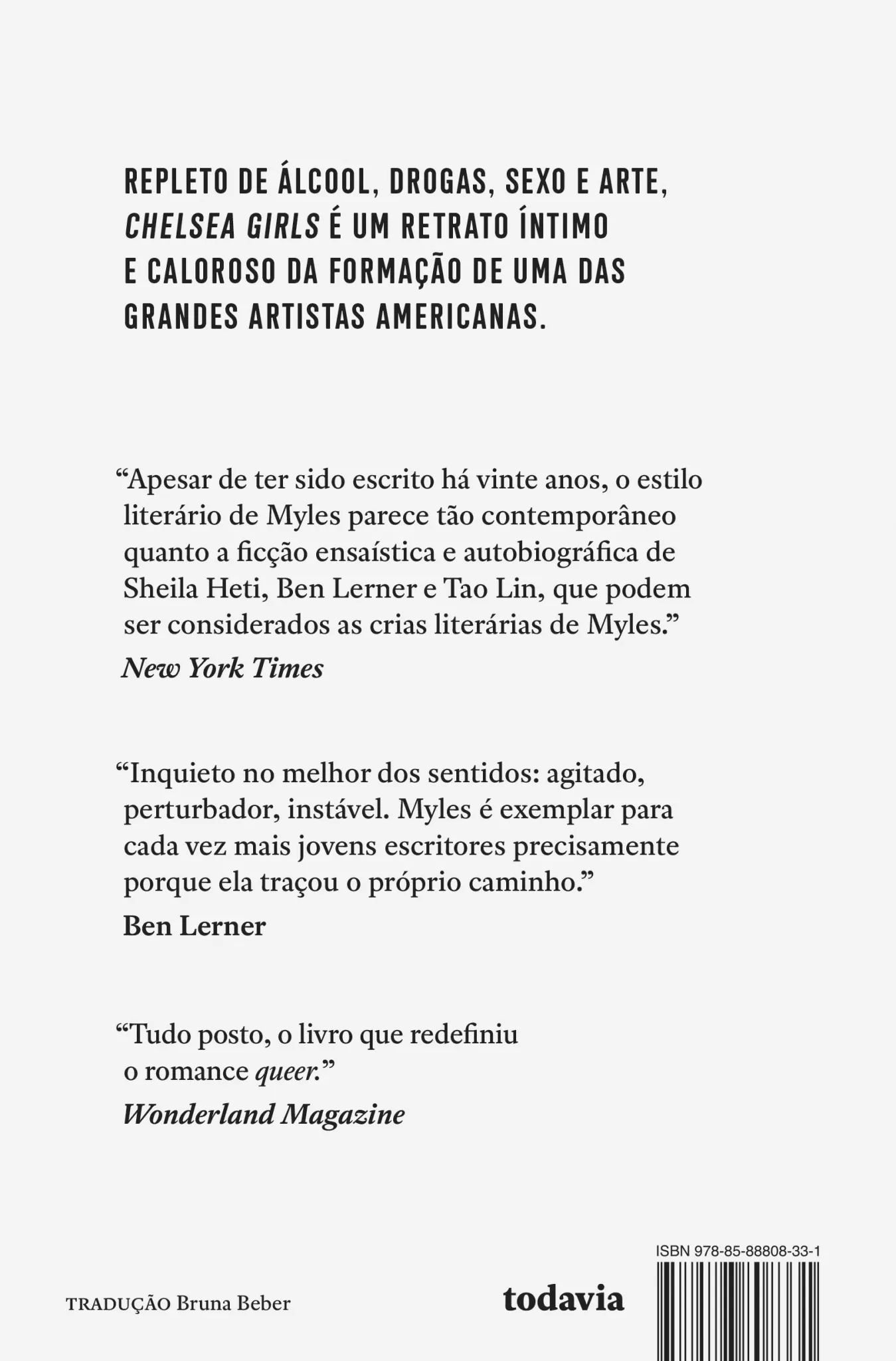 Repleto de álcool, drogas, sexo e arte, este cultuado romance é um retrato íntimo e caloroso da formação de um dos grandes nomes da poesia contemporânea americana. Neste romance, Eileen Myles transforma a própria vida em uma obra de arte. Dividido em episódios curtos, que transitam entre o humor, a confissão e o drama, Chelsea Girls traça um retrato assombroso dessa vida intimamente ligada à arte. Poeta, performer, romancista e jornalista, Myles é, nas palavras da escritora Deborah Levy, “a peça perdida para qualquer um que só tenha lido escritores homens da geração beat”. Cheio da energia da época que mudou para sempre as letras americanas, o livro é ao mesmo tempo um testemunho do caldo cultural que agitou a cidade de Nova York nos anos 1970 – as festas, os bares, os festivais, a música e a poesia – e um relato de quem ajudou a forjar essa época. Uma crônica moderna de como uma jovem escritora quebrou com as correntes de uma rígida identidade cultural que jamais a definiu. Um retrato poderoso, comovente e divertido de uma época de efervescência e liberdade.
