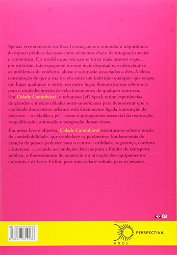 Em Cidade Caminhável, o urbanista Jeff Speck reúne experiências de grandes e médias cidades norte-americanas para demonstrar que a vitalidade dos centros urbanos está diretamente ligada à assunção do pedestre – o cidadão a pé – como o protagonista essencial da reativação, requali cação, animação e integração dessas áreas.