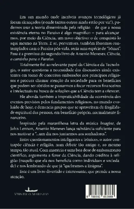 Em um mundo onde incríveis avanços tecnológicos já foram alcançados (e onde tantos outros ainda estão por vir), podemos usar a teoria disseminada pela religião – de que a nossa existência eterna no Paraíso é algo magnífico – para alcançarmos, por meio da Ciência, um novo objetivo: o de conquistá-lo aqui mesmo na Terra. E se, porventura, também fôssemos contemplados com o Paraíso pós-vida, seria uma espécie de “bônus”. Esta é a premissa do segundo livro de Arsenio Meneses: Ciência: o caminho para o paraíso.