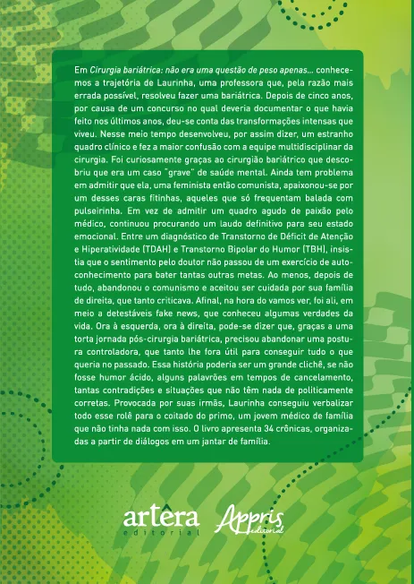 Em Cirurgia bariátrica: não era uma questão de peso apenas… conhecemos a trajetória de Laurinha, uma professora que, pela razão mais errada possível, resolveu fazer uma bariátrica. Depois de cinco anos, por causa de um concurso no qual deveria documentar o que havia feito nos últimos anos, deu-se conta das transformações intensas que viveu. Nesse meio tempo desenvolveu, por assim dizer, um estranho quadro clínico e fez a maior confusão com a equipe multidisciplinar da cirurgia. Foi curiosamente graças ao cirurgião bariátrico que descobriu que era um caso “grave” de saúde mental. Ainda tem problema em admitir que ela, uma feminista então comunista, apaixonou-se por um desses caras fitinhas, aqueles que só frequentam balada com pulseirinha. Em vez de admitir um quadro agudo de paixão pelo médico, continuou procurando um laudo definitivo para seu estado emocional. Entre um diagnóstico de Transtorno de Déficit de Atenção e Hiperatividade (TDAH) e Transtorno Bipolar do Humor (TBH), insistia que o sentimento pelo doutor não passou de um exercício de autoconhecimento para bater tantas outras metas. Ao menos, depois de tudo, abandonou o comunismo e aceitou ser cuidada por sua família de direita, que tanto criticava. Afinal, na hora do vamos ver, foi ali, em meio a detestáveis fake news, que conheceu algumas verdades da vida. Ora à esquerda, ora à direita, pode-se dizer que, graças a uma torta jornada pós-cirurgia bariátrica, precisou abandonar uma postura controladora, que tanto lhe fora útil para conseguir tudo o que queria no passado. Essa história poderia ser um grande clichê, se não fosse humor ácido, alguns palavrões em tempos de cancelamento, tantas contradições e situações que não têm nada de politicamente corretas. Provocada por suas irmãs, Laurinha conseguiu verbalizar todo esse rolê para o coitado do primo, um jovem médico de família que não tinha nada com isso. O livro apresenta 34 crônicas, organizadas a partir de diálogos em um jantar de família.