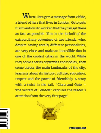 When Clara gets a message from Vickie, a friend of hers that lives in London, Guto puts his invention to work so that they can get there as fast as possible. This is the kickoff of the extraordinary adventure of two friends, who, despite having totally different personalities, are very close and make an incredible duo in one of the coolest cities in the world. While they solve a series of puzzles and riddles, they come across the main landmarks of the cirty, learning about its history, culture, education, respect and the power of friendship. A story with a twist in the tail, “Clara and Guto – The Secrets of London” captures the reader´s attention from the very first page!