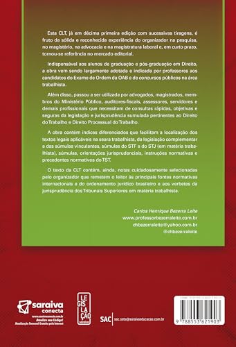 Esta obra, organizada pelo professor Carlos Henrique Bezerra Leite, tem por objetivo propiciar ao leitor uma consulta rápida, objetiva, segura e completa das fontes normativas que podem ser utilizadas para a resolução de provas e questões de concursos públicos e do Exame de Ordem da OAB, como também para a atuação profissional e ou acadêmica relacionada à interpretação e aplicação do Direito do Trabalho e do Direito Processual do Trabalho no Brasil.
