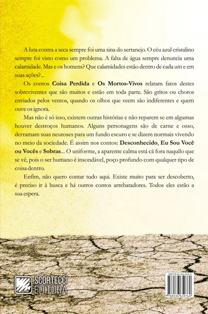 A vida na seca caminha com o sol e isto é a realidade cotidiana que atemoriza e envolve os viventes no semiárido. Os personagens de Coisa Perdida tentam em vão brigar com o inevitável, os sofrimentos que faz os pensar e concluir, que cuia vale a vida? Onde tentar a sorte? Hoje todos sabem que o ambiente não é mais hostil que os desgovernos e tiranias como em qualquer outro lugar. Em outros contos: os personagens tocam o desconhecido dentro de si mesmo. O homem desconhece as aberrações internas que alofram em qualquer realidade e tornam se abismos. A luta contra a seca sempre foi uma sina do sertanejo. O céu azul cristalino sempre foi visto como um problema. A falta de água sempre denuncia uma calamidade. Mas e os homens? Que calamidades estão dentro de cada um e em suas ações?… Os contos Coisa Perdida e Os Mortos-Vivos relatam fatos destes sobreviventes que são muitos e estão em toda parte. São gritos ou choros enviados pelos ventos, quando os olhos que veem são indiferentes e quem ouve os ignora. Mas não é só isso, existem outras histórias e não reparem se em algumas houver destroços humanos. Alguns personagens são de carne e osso, derramam suas neuroses para um fundo escuro e se dizem normais vivendo no meio da sociedade.