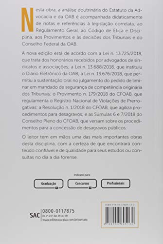 Esta obra é leitura obrigatória para aplicação da Lei n. 8.906/94, sendo largamente citada nos Tribunais, nos Conselhos Federais e nas Seccionais da OAB. É referência entre alunos da graduação, inclusive quem está prestando o Exame da OAB, e profissionais do Direito pela exposição didática e objetiva das análises a cada um dos artigos que compõem o Estatuto. O estudo da matéria é acompanhado de notas e referências a decisões dos Tribunais e da OAB, ao regulamento geral, ao Código de Ética e Disciplina e aos provimentos. O autor também promoveu cuidadosa seleção de decisões da jurisprudência dos tribunais superiores e do Conselho Federal da OAB. A nova edição está de acordo com a Lei n. 13.725/2018, que trata dos honorários recebidos por advogados de sindicatos e associações; a Lei n. 13.688/2018, que instituiu o Diário Eletrônico da OAB; a Lei n. 13.676/2018, que permitiu a sustentação oral no julgamento do pedido de liminar em mandado de segurança de competência originária dos Tribunais; o Provimento n. 179/2018 do CFOAB, que regulamenta Registro Nacional de Violações de Prerrogativas; a Resolução n. 1/2018 do CFOAB, que agiliza procedimentos para desagravos; e as Súmulas 6 e 7/2018 do Conselho Pleno do CFOAB, que versam sobre os procedimentos para a concessão de desagravos públicos.