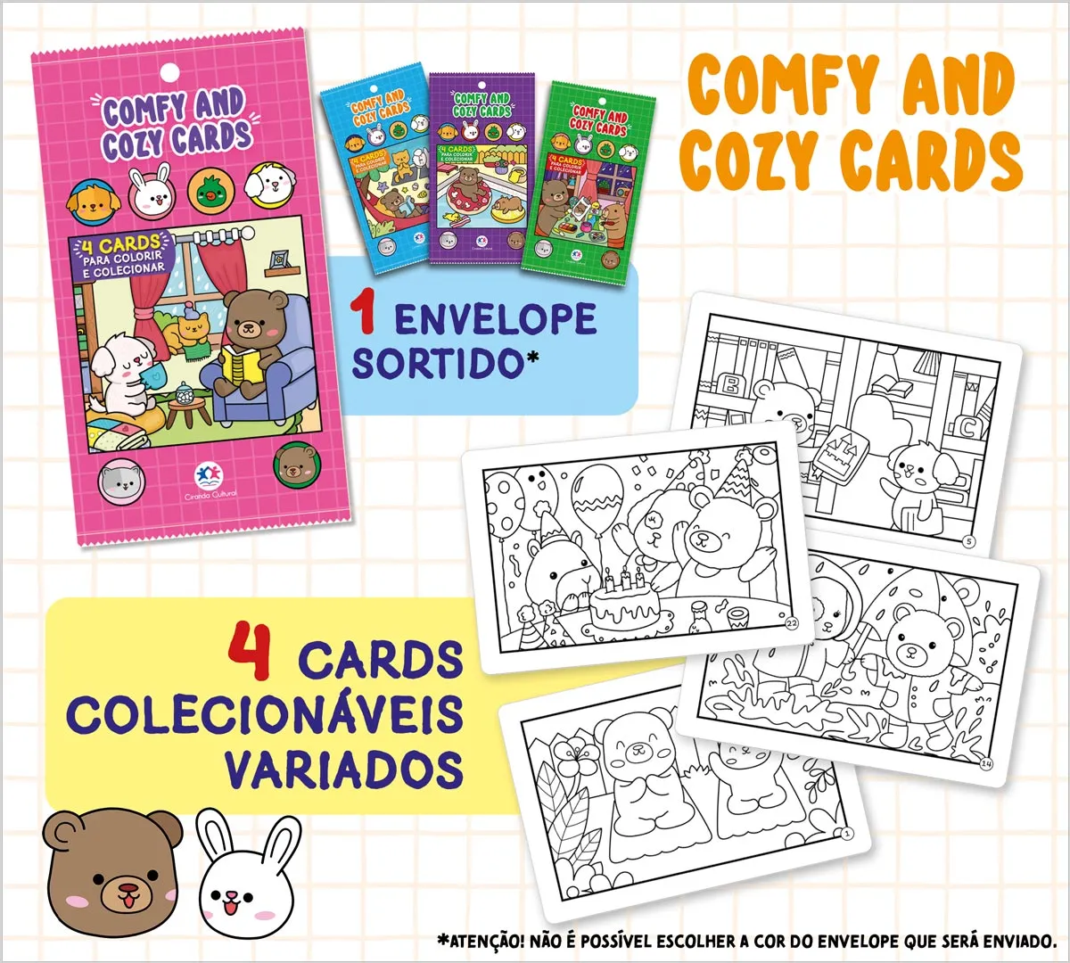 Descubra a magia dos Comfy and Cozy Cards para colorir e colecionar! Prepare-se para se encantar com uma experiência única e divertida. Cada envelope sortido traz 4 cards colecionáveis e variados, prontos para despertar sua criatividade. Perfeito para todas as idades, trazem um momento relaxante no seu dia. Se vier repetido, troque sua figurinha com seu amigo e torne a brincadeira ainda mais divertida com quem você gosta. Comece agora sua coleção e mergulhe nesse universo criativo! *Atenção! Não é possível escolher a cor do envelope que será enviado.
