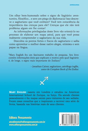 Um olhar bem-humorado sobre o signo de Sagitário: aventureiro, filosófico… e sem um pingo de diplomacia! Isso descreve o sagitariano que você conhece? As informações privilegiadas deste livro vão orientá-lo no processo de elaborar um mapa astral, para que você possa realmente compreender o sagitariano da sua vida. Descubra os pontos fortes e fracos do sagitariano e saiba como aproveitar o melhor desse nativo alegre, otimista e sem papas na língua.