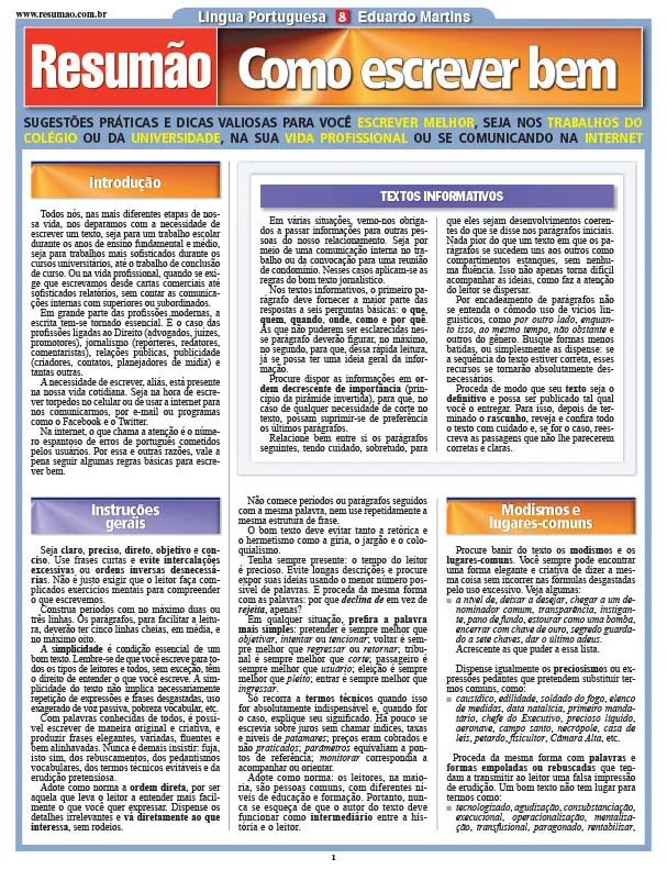 Este Resumão traz sugestões práticas e dicas valiosas para escrever melhor, seja nos trabalhos escolares, na vida profissional ou na comunicação pela internet. É um excelente guia para elaborar textos. Confira os principais temas abordados: modismos e lugares-comuns, textos informativos, exatidão e precisão, colocação dos termos na oração, posição das palavras na oração e colocação pronominal.