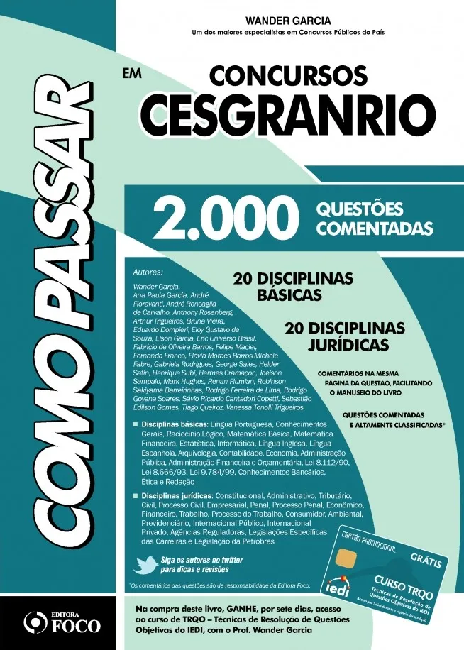 – 20 Disciplinas Jurídicas: Constitucional, Administrativo, Tributário, Civil, Processo Civil, Empresarial, Penal, Processo Penal, Econômico, Financeiro, Trabalho, Processo do Trabalho, Consumidor, Ambiental, Previdenciário, Internacional Público, Internacional?Privado, Agências Reguladoras, Legislações Específicas das Carreiras e Legislação da Petrobras