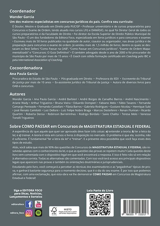 Estudando pelo livro, você começará a perceber as técnicas dos examinadores e as “pegadinhas” típicas de prova, e ganhará bastante segurança para o momento decisivo, que é o dia do seu exame. É por isso que podemos afirmar, com uma exclamação, que esta obra vai lhe demonstrar COMO PASSAR em Concursos de Magistratura Estadual e Federal!