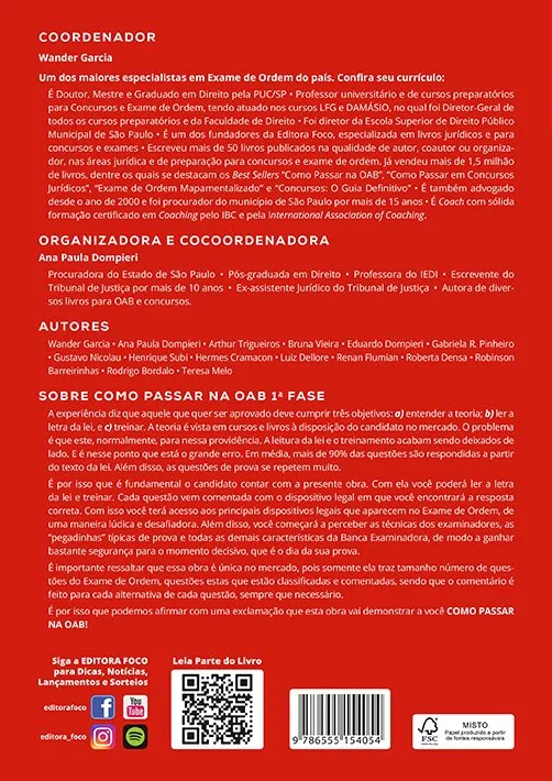 É importante ressaltar que essa obra é única no mercado, pois somente ela traz tamanho número de questões do Exame de Ordem e da FGV, questões estas que estão classificadas e comentadas, sendo que o comentário é feito para cada alternativa de cada questão, sempre que necessário.