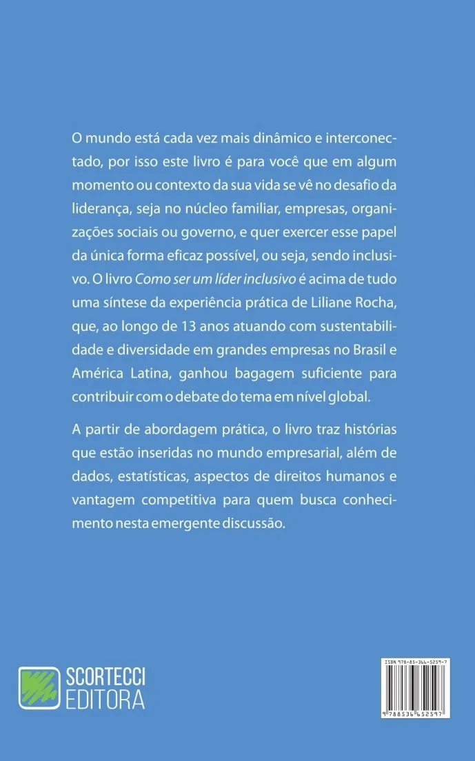 Para todos aqueles que estão em posição de liderança nos mais variados contextos e instituições o livro “Como ser um líder inclusivo” é acima de tudo uma síntese da experiência prática da Liliane Rocha, que ao longo de 13 anos atuando com Sustentabilidade e Diversidade em grandes empresas no Brasil e América Latina ganhou bagagem suficiente para contribuir com o debate do tema junto as empresas brasileiras e até internacionais. A partir de abordagem prática, o livro traz histórias que estão inseridas no mundo empresarial, além de dados, estatísticas, aspectos de direitos humanos e vantagem competitiva para quem busca conhecimento nesta emergente discussão.