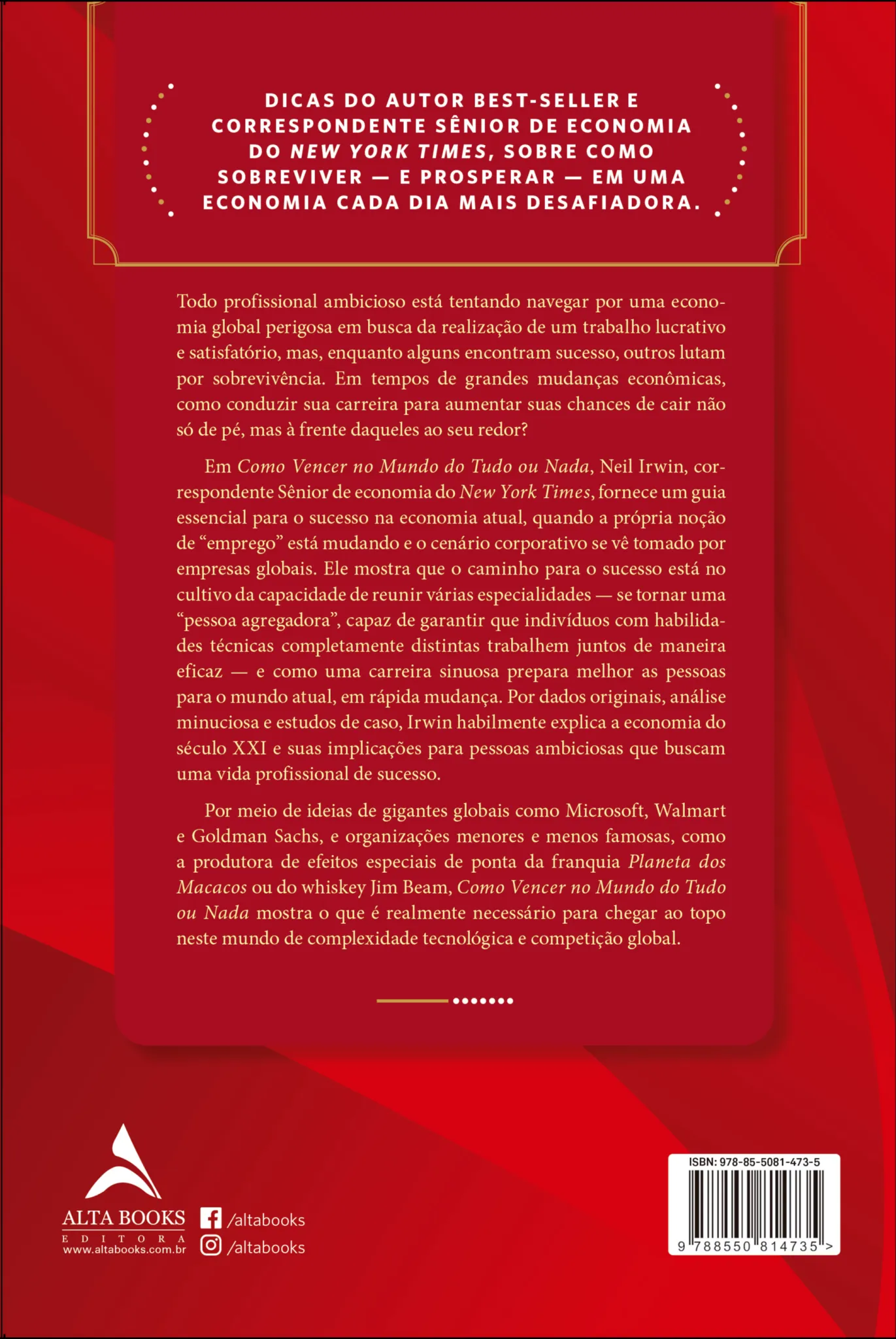 de “emprego” está mudando e o cenário corporativo se vê tomado por empresas globais. Ele mostra que o caminho para o sucesso está no cultivo da capacidade de reunir várias especialidades — se tornar uma “pessoa agregadora”, capaz de garantir que indivíduos com habilidades técnicas completamente distintas trabalhem juntos de maneira eficaz — e como uma carreira sinuosa prepara melhor as pessoas para o mundo atual, em rápida mudança. Por dados originais, análise minuciosa e estudos de caso, Irwin habilmente explica a economia do século XXI e suas implicações para pessoas ambiciosas que buscam uma vida profissional de sucesso. Por meio de ideias de gigantes globais como Microsoft, Walmart e Goldman Sachs, e organizações menores e menos famosas, como a produtora de efeitos especiais de ponta da franquia Planeta dos Macacos ou do whiskey Jim Beam, Como Vencer no Mundo do Tudo ou Nada mostra o que é realmente necessário para chegar ao topo neste mundo de complexidade tecnológica e competição global.a