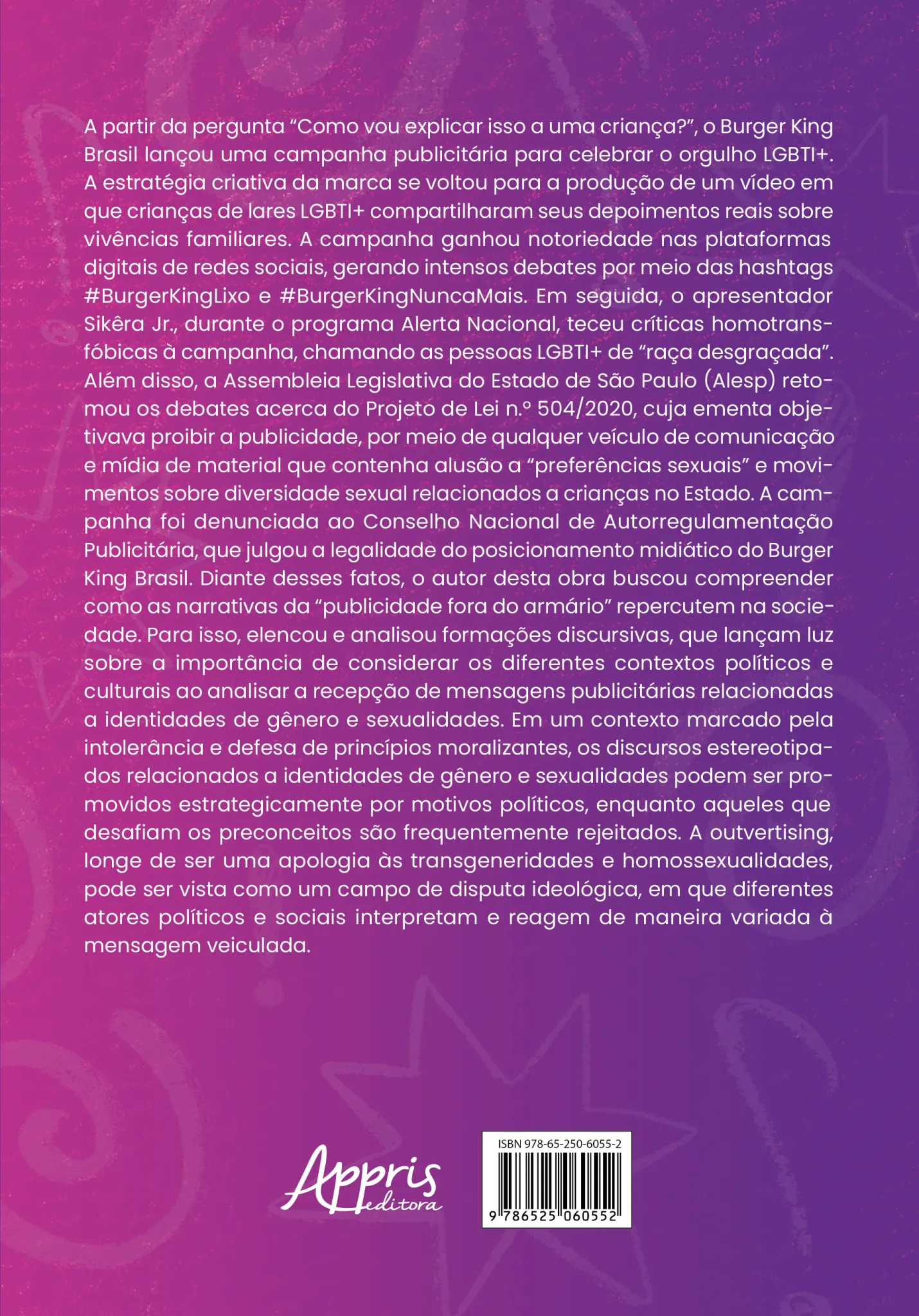 A partir da pergunta “Como vou explicar isso a uma criança?”, o Burger King Brasil lançou uma campanha publicitária para celebrar o orgulho LGBTI+. A estratégia criativa da marca se voltou para a produção de um vídeo em que crianças de lares LGBTI+ compartilharam seus depoimentos reais sobre vivências familiares. A campanha ganhou notoriedade nas plataformas digitais de redes sociais, gerando intensos debates por meio das hashtags #BurgerKingLixo e #BurgerKingNuncaMais. Em seguida, o apresentador Sikêra Jr., durante o programa Alerta Nacional, teceu críticas homotransfóbicas à campanha, chamando as pessoas LGBTI+ de “raça desgraçada”. Além disso, a Assembleia Legislativa do Estado de São Paulo (Alesp) retomou os debates acerca do Projeto de Lei n.º 504/2020, cuja ementa objetivava proibir a publicidade, por meio de qualquer veículo de comunicação e mídia de material que contenha alusão a “preferências sexuais” e movimentos sobre diversidade sexual relacionados a crianças no Estado. A campanha foi denunciada ao Conselho Nacional de Autorregulamentação Publicitária, que julgou a legalidade do posicionamento midiático do Burger King Brasil. Diante desses fatos, o autor desta obra buscou compreender como as narrativas da “publicidade fora do armário” repercutem na sociedade. Para isso, elencou e analisou formações discursivas, que lançam luz sobre a importância de considerar os diferentes contextos políticos e culturais ao analisar a recepção de mensagens publicitárias relacionadas a identidades de gênero e sexualidades. Em um contexto marcado pela intolerância e defesa de princípios moralizantes, os discursos estereotipados relacionados a identidades de gênero e sexualidades podem ser promovidos estrategicamente por motivos políticos, enquanto aqueles que desafiam os preconceitos são frequentemente rejeitados. A outvertising, longe de ser uma apologia às transgeneridades e homossexualidades, pode ser vista como um campo de disputa ideológica, em que diferentes atores políticos e sociais interpretam e reagem de maneira variada à mensagem veiculada.