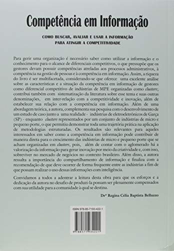 Para gerir uma organização é necessário saber como utilizar a informação e o conhecimento para o alcance de diferenciais competitivos, o que pressupõe que os gestores devam possuir competências atreladas aos processos administrativos, à competência na gestão de pessoas e à competência em informação. Assim, a riqueza do livro é ser multifacetada, considerando-se que oferece uma excelente análise sobre as características e a situação da competência em informação de gestores como diferencial competitivo de indústrias de MPE organizadas como clusters; contribui também com sistematização da literatura sobre esse tema e suas outras denominações, em inter-relação com a competitividade e inovação, além de estabelecer sua relação com a competência em informação. Além de uma abordagem teórica, a autora, complementa sua pesquisa com o desenvolvimento de um estudo de caso junto a uma realidade – indústrias de eletroeletrônicos de Garça (SP) – enquanto clusters representados por um conjunto de indústrias de micro e pequeno porte, o que permitiu demonstrar toda uma trajetória prática na aplicação de metodologias estruturadas. Os resultados são relevantes para aqueles interessados em saber como a competência em informação pode contribuir de maneira direta para o crescimento das indústrias de micro e pequeno porte que se acham organizadas em clusters, pois, além de contar com o aglomerado há a valorização da informação para gerar inovação por meio da criatividade e, com isso, sobreviver no mercado de negócios no contexto brasileiro. Além disso, a autora ressalta a importância do compartilhamento de informação e finaliza com a recomendação de que deve ocorrer de forma frequente entre as indústrias a fim de que possam realizar o uso dessas informações com inteligência.
