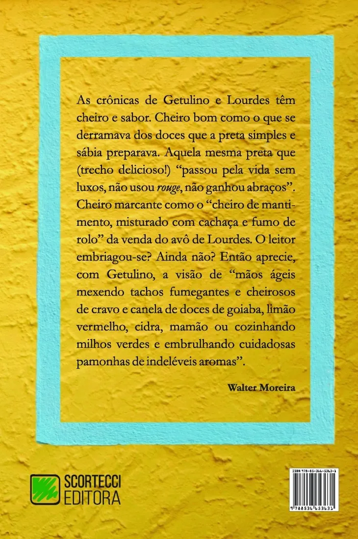 As crônicas de Getulino e Lourdes têm cheiro e sabor. Cheiro bom como o que se derramava dos doces que a preta simples e sábia preparava. Aquela mesma preta que (trecho delicioso!) “passou pela vida sem luxos, não usou rouge, não ganhou abraços”. Cheiro marcante como o “cheiro de mantimento, misturado com cachaça e fumo de rolo” da venda do avô de Lourdes. O leitor embriagou-se? Ainda não? Então aprecie, com Getulino, a visão de “mãos ágeis mexendo tachos fumegantes e cheirosos de cravo e canela de doces de goiaba, limão vermelho, cidra, mamão ou cozinhando milhos verdes e embrulhando cuidadosas pamonhas de indeléveis aromas”.