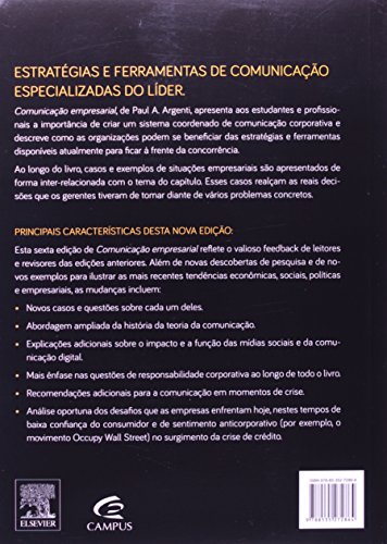 Comunicação Empresarial é um tema bastante abrangente cujas faces mais conhecidas podem ser as relações com a mídia e comunicação em crises, porém também inclui a comunicação interna, relações com governos e investidores. Nesta edição, Paul Argenti adiciona novos casos e um capítulo completo sobre Responsabilidade Social Empresarial. Este livro, clássico em sua área, se aprofunda em sua missão de integrar a comunicação de diversas áreas da empresa para colaborar na construção da identidade, imagem e reputação.