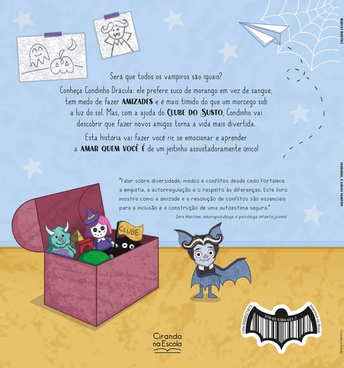 Será que todos os vampiros são iguais? Conheça Condinho Drácula: ele prefere suco de morango em vez de sangue, tem medo de fazer amizades e é mais tímido do que um morcego na luz do sol. Mas com a ajuda de seus amigos do Clube do Susto, Condinho vai descobrir que fazer novos amigos é o que torna a vida divertida. Uma história que vai fazer você rir, se emocionar e aprender a amar quem você e, de um jeitinho assustadoramente único!