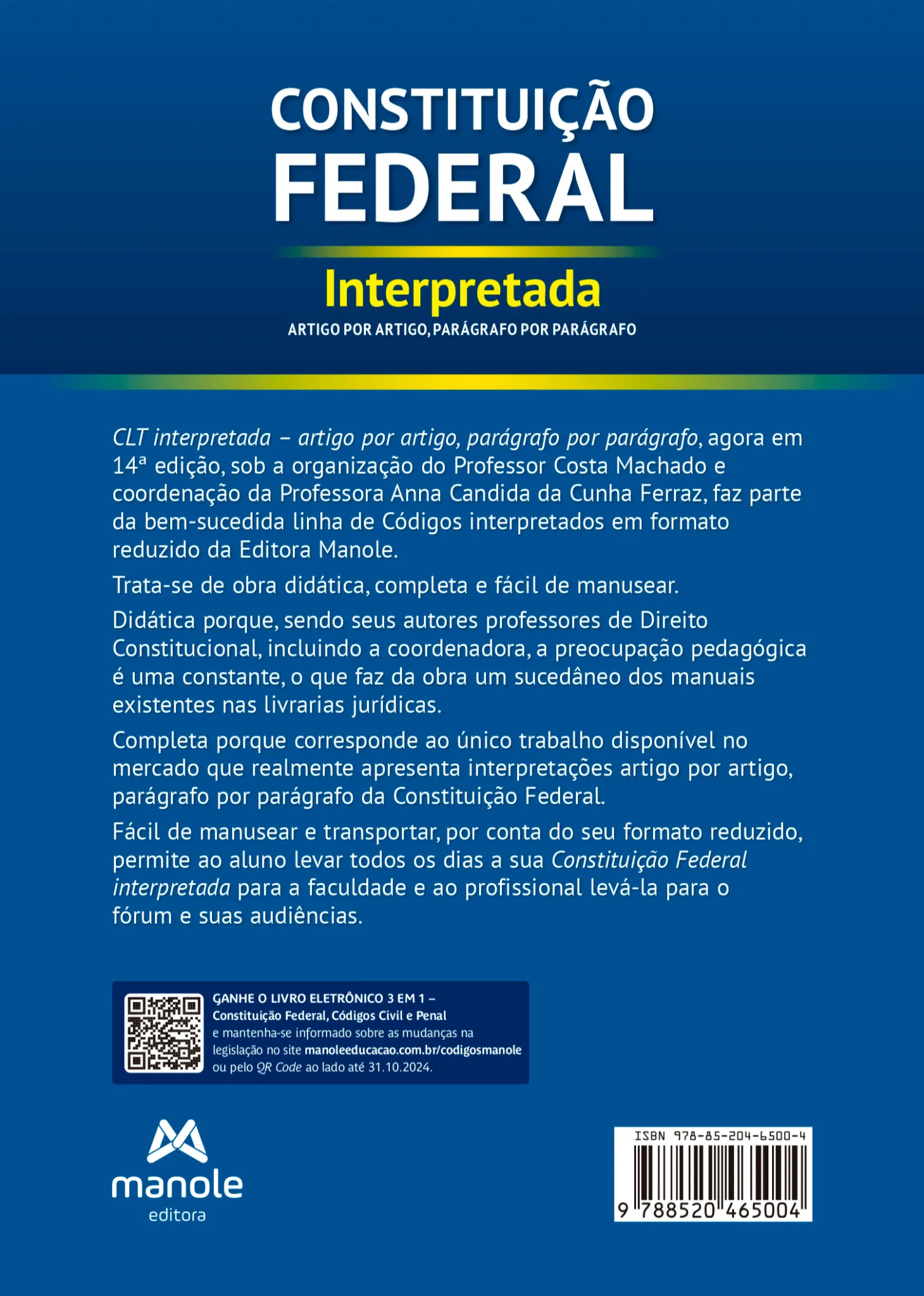 Constituição Federal interpretada – artigo por artigo, parágrafo por parágrafo, agora em 14ª edição, sob a organização do Professor Costa Machado e coordenação da Professora Anna Candida da Cunha Ferraz, faz parte da bem-sucedida linha de Códigos interpretados em formato reduzido da Editora Manole.